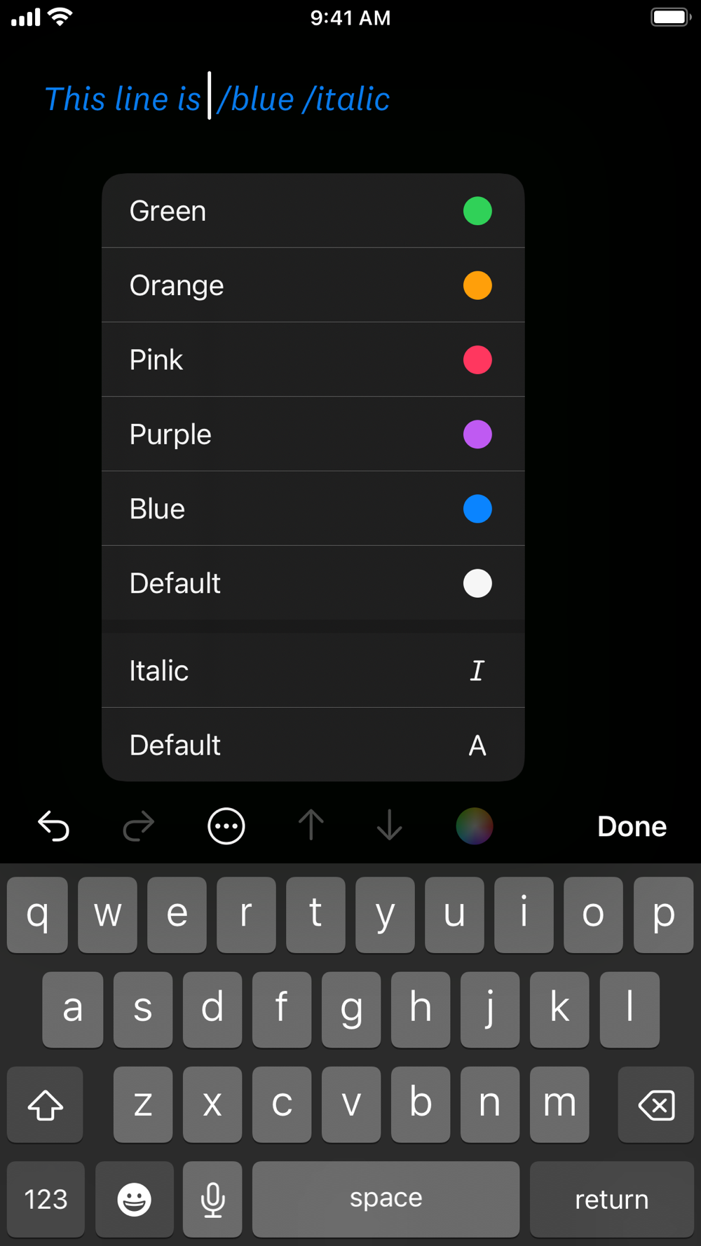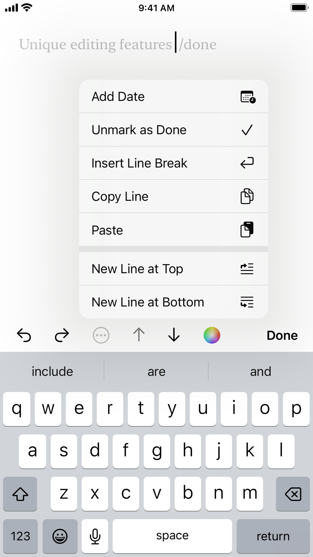 Tap the ⋯ button above the keyboard for more line options, such as adding the date and time and inserting a line break.