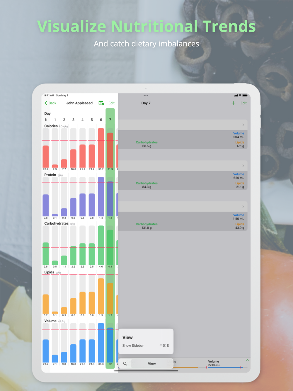 - Get the daily and average nutritional trends of the patients, compared with their nutritional objectives. Up to 7 days in the free version, unlimited after unlocking.