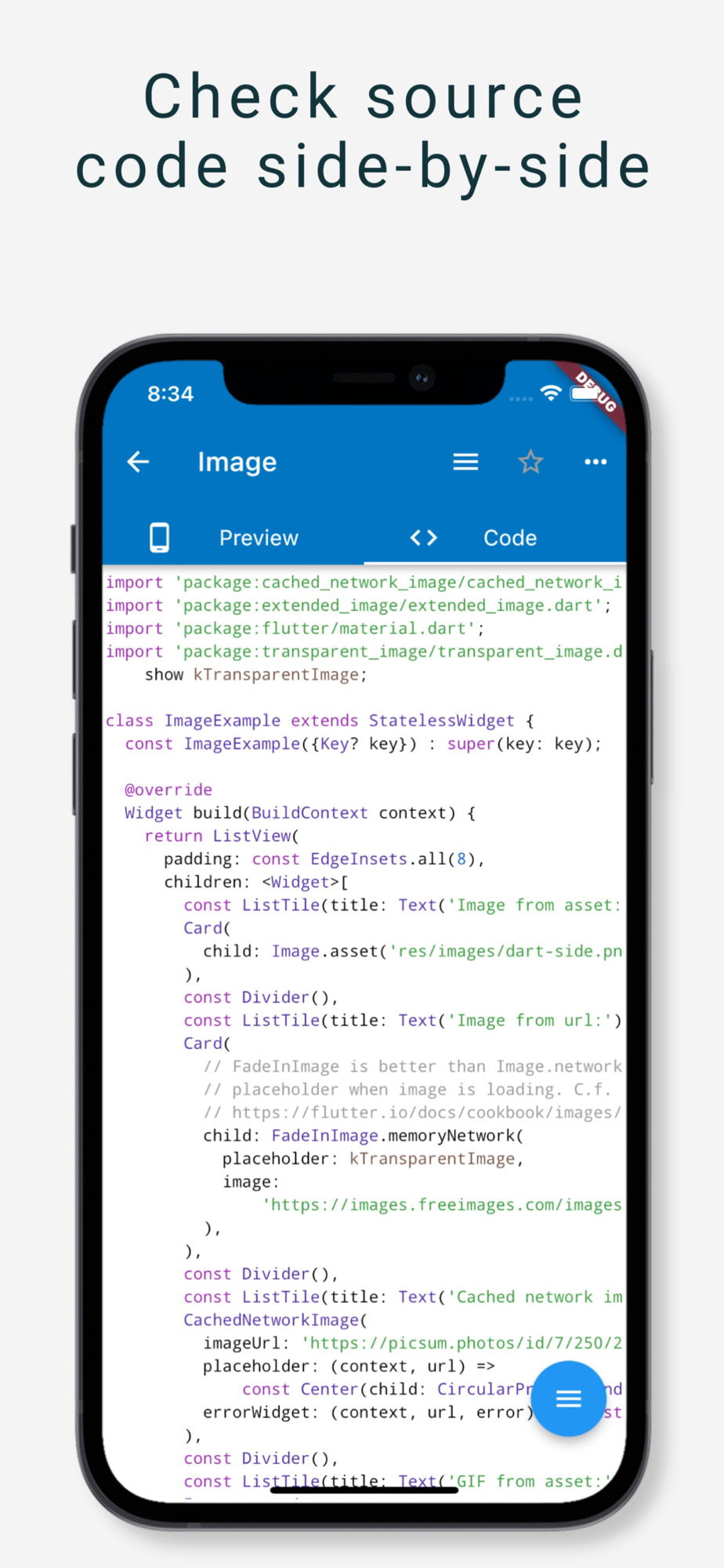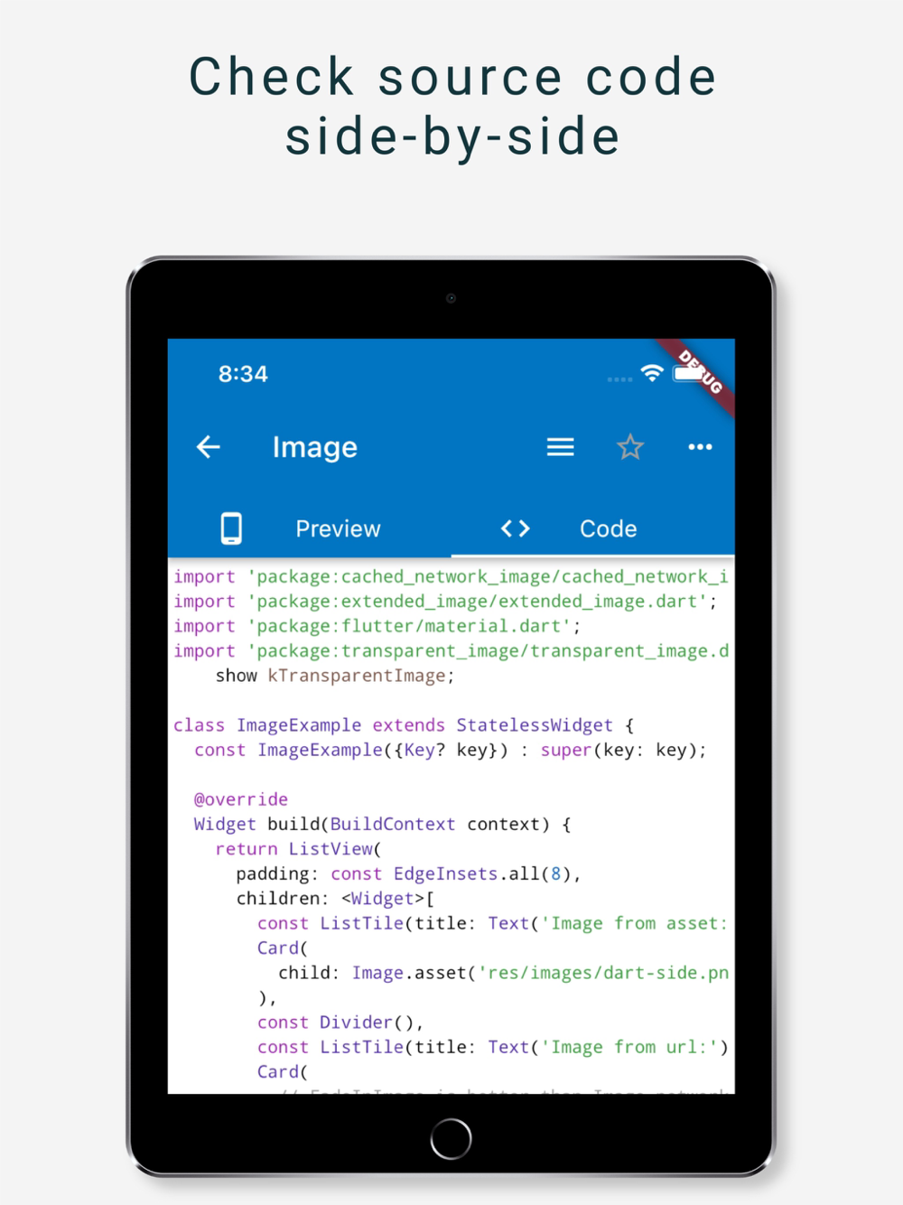An opensource app showcasing Flutter components, with side-by-side source code view.