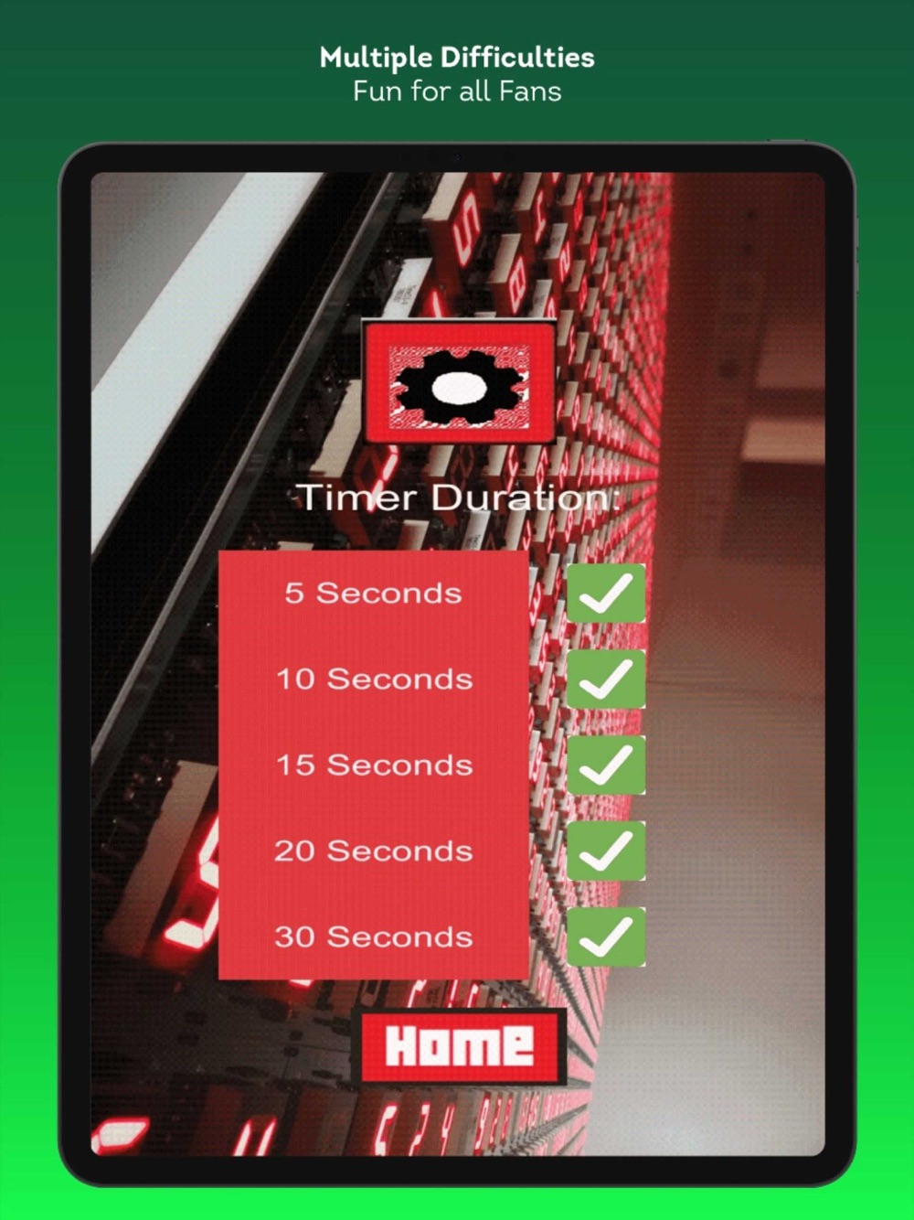 A limited amount of time is given to answer each question, to add challenge and excitement to the game. This timer can be adjusted in the settings menu.