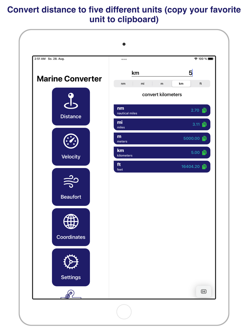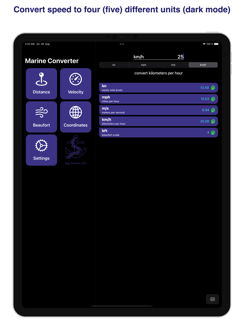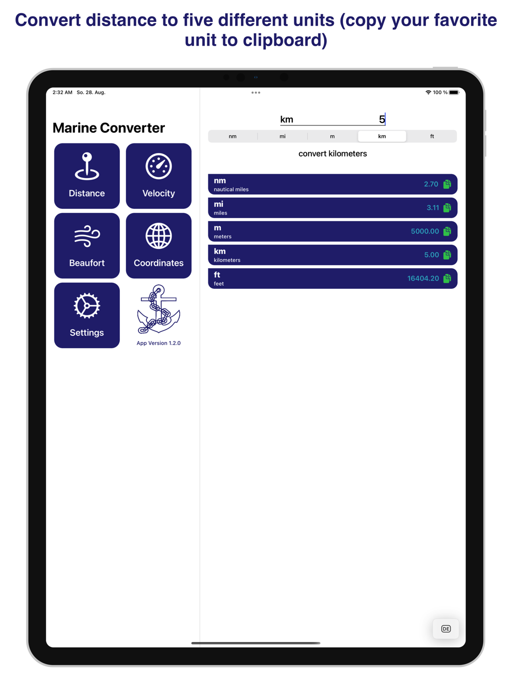 The Marine Converter App converts the nautical units. A wonderful companion for quickly and easily calculating the units at sea or on land. The app is available worldwide in English and German.