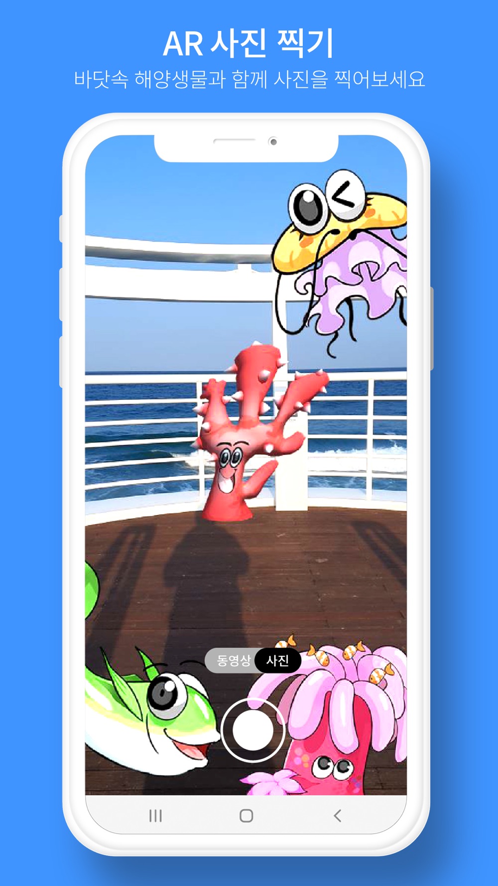 해중공원에서 서식하는 바닷속 생물을 AR로 구현하여 함께 관찰하고 학습할 수 있습니다. 또 AR사진 서비스를 이용해 해양생물과 사진을 찍고 추억을 남겨보세요!