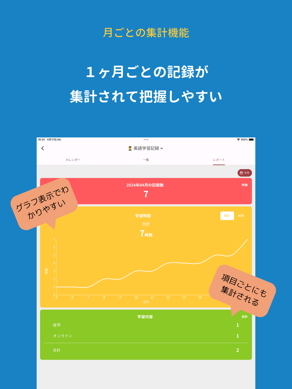 ・毎日の学習や練習の記録を簡単に素早く記録して1ヶ月の学習量を集計したい