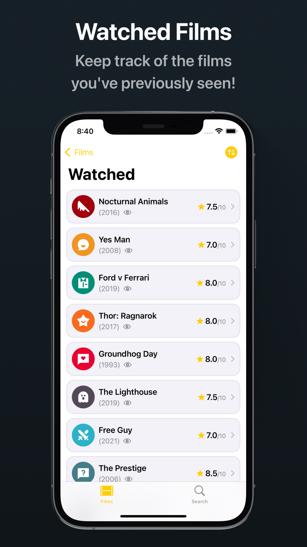 – Search screen displays all previously added films and provides search assistance with suggestions. You can look through all of the films, including those on your Watchlist and those you've already seen. You can access the film detail screen by pressing on one of the listed films. You can also perform shortcut actions while searching your films!
