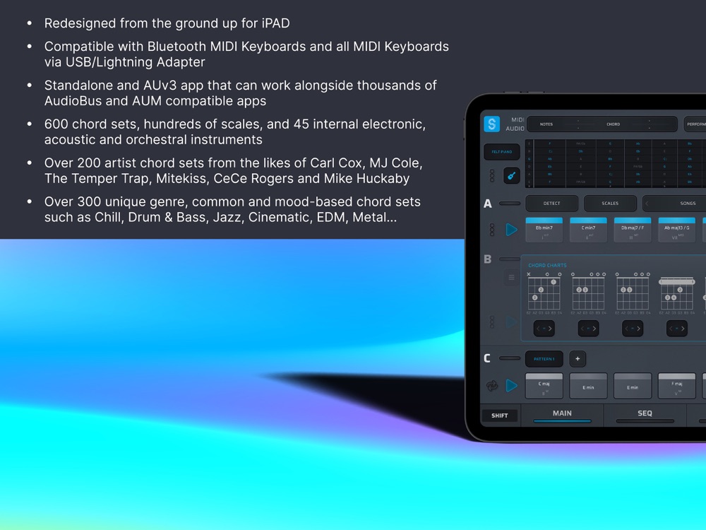 Scaler 2 iOS is a multiple award winning music theory workstation redesigned from the ground up for iPad OS. Scaler 2 is an inspirational and creative music tool that gives you access to a world of new ideas, expressions and melodies. With powerful detection of MIDI and audio, Scaler 2 can determine what key and scale you’re in and suggest chords, melodies and basslines that match your music. Scaler 2 can connect to any keyboard, synth or device using bluetooth audio and midi. Scaler is fully compatible with GarageBand and Audio Mixers to get you writing music on the fly in an environment that suits you. Scaler 2 makes finding chords and progressions intuitive and fun! It’s a comprehensive but easy to use toolbox that will help anyone make better music.
