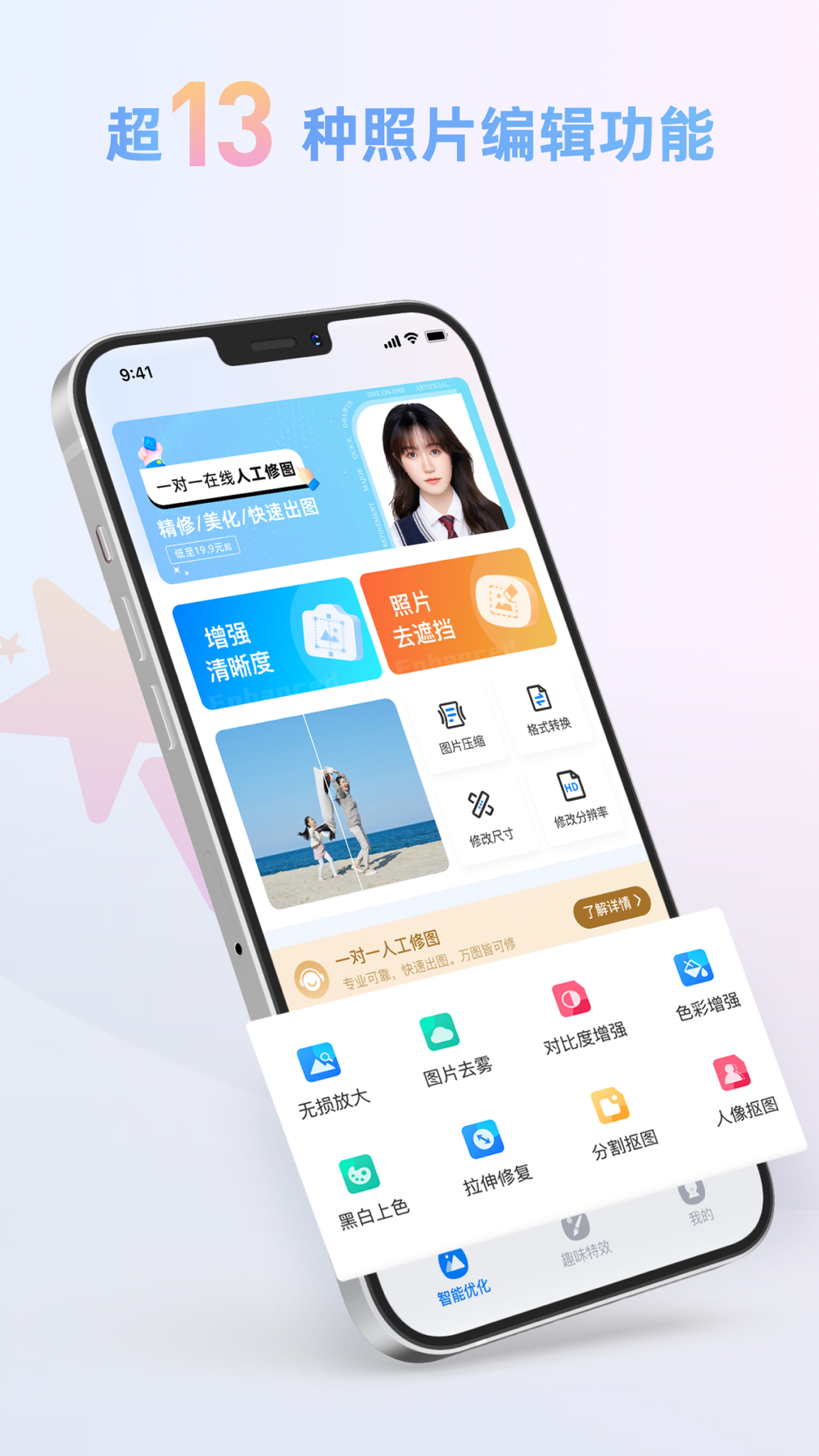智能调整过暗或过亮的图片,增添图片层次和细节表现,让图片清晰醒目,色彩鲜明艳丽