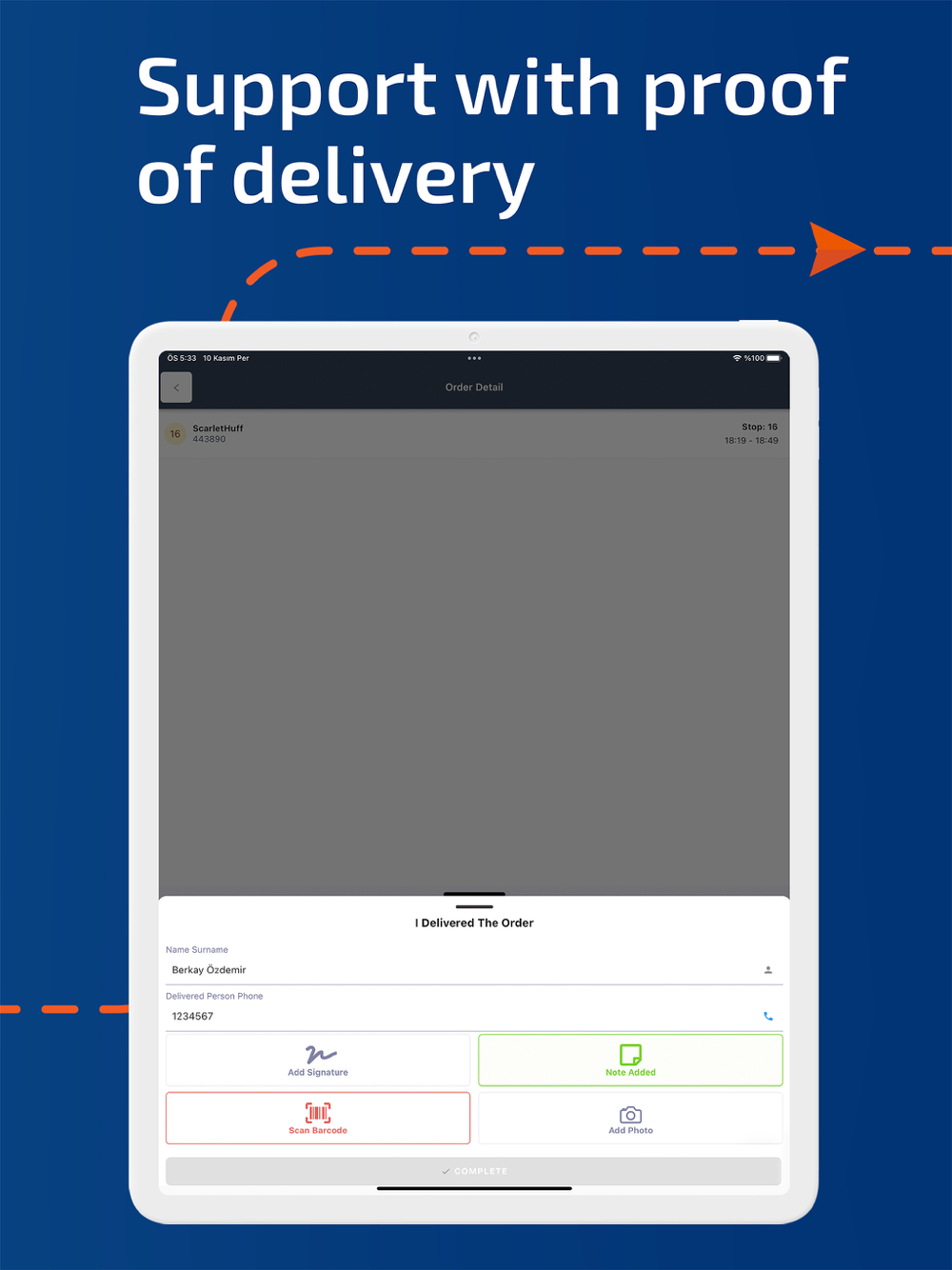 • Proof-of-delivery through on-screen signatures, notes and photos