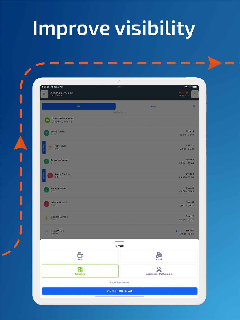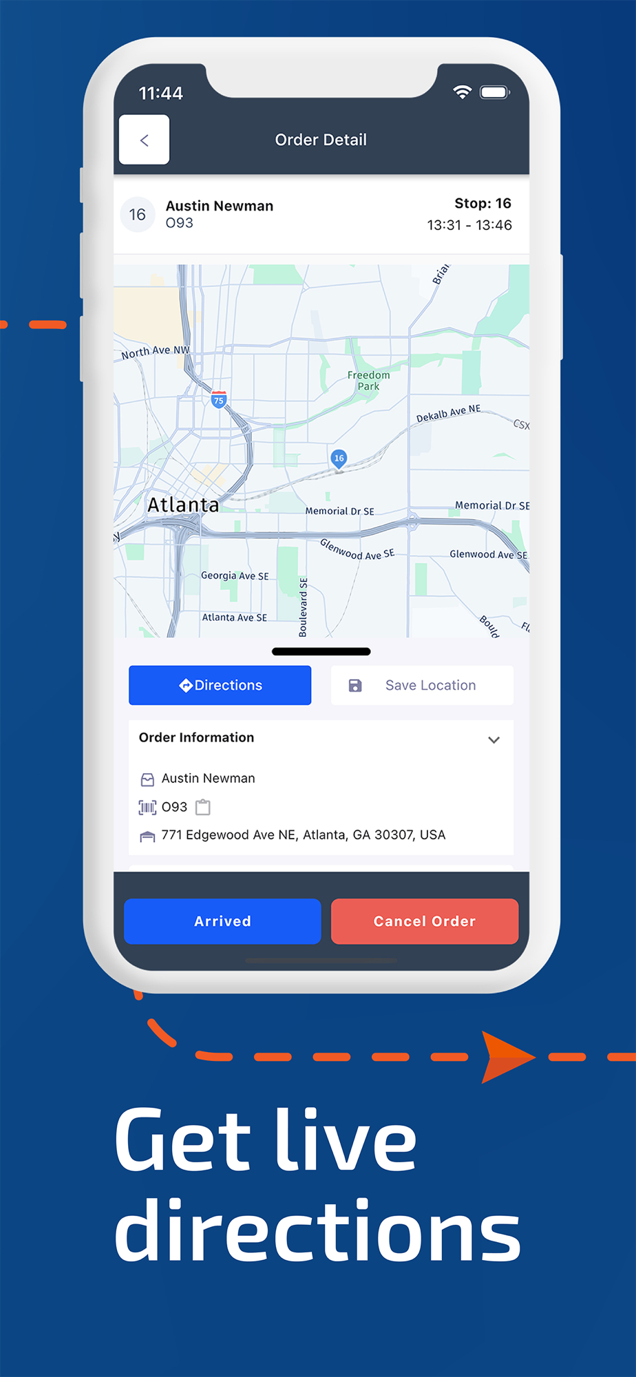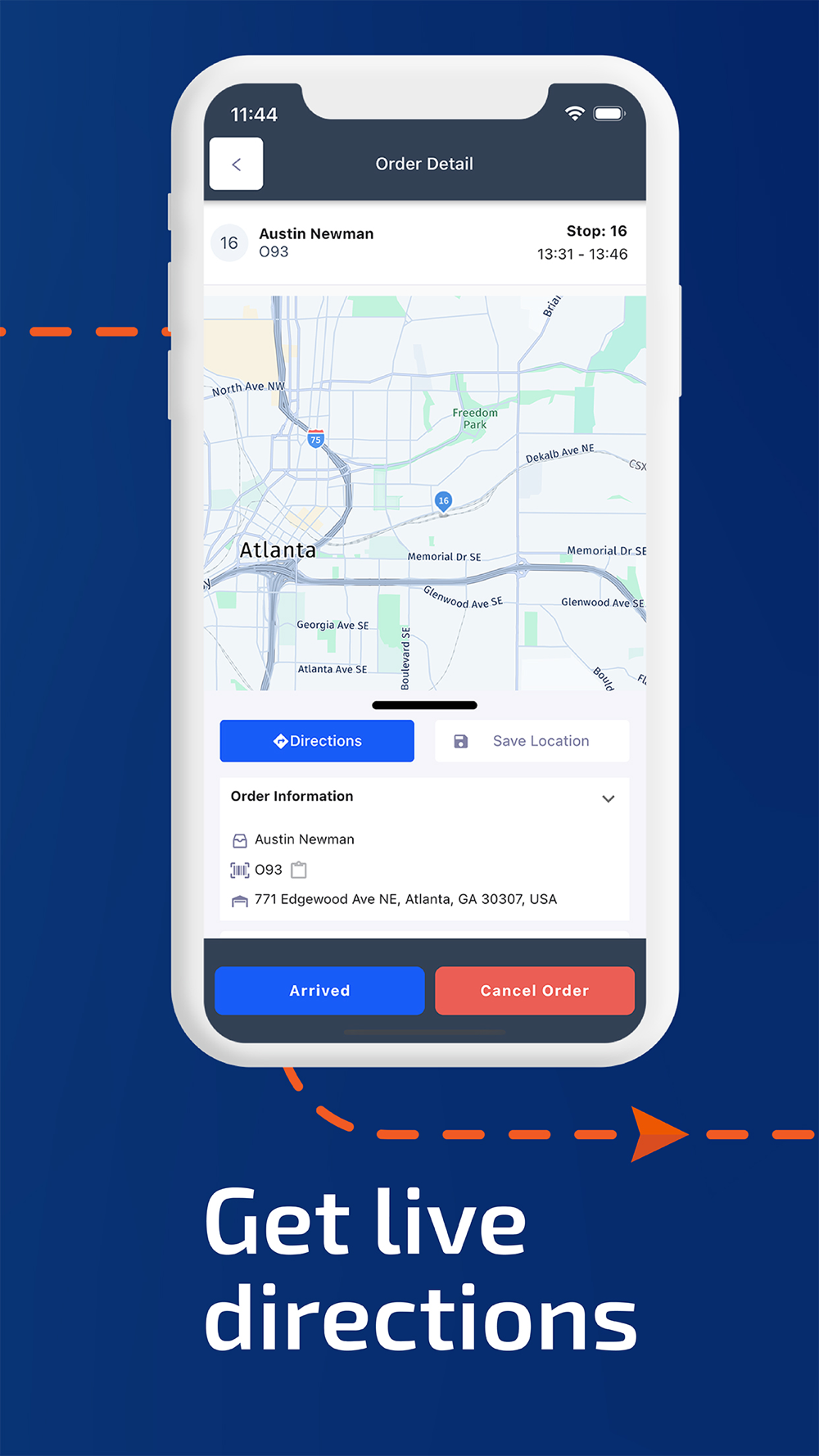 • Ability to see all orders on the map or as a scrollable list with detailed order information and ETAs