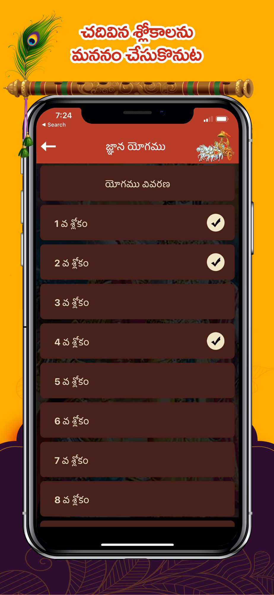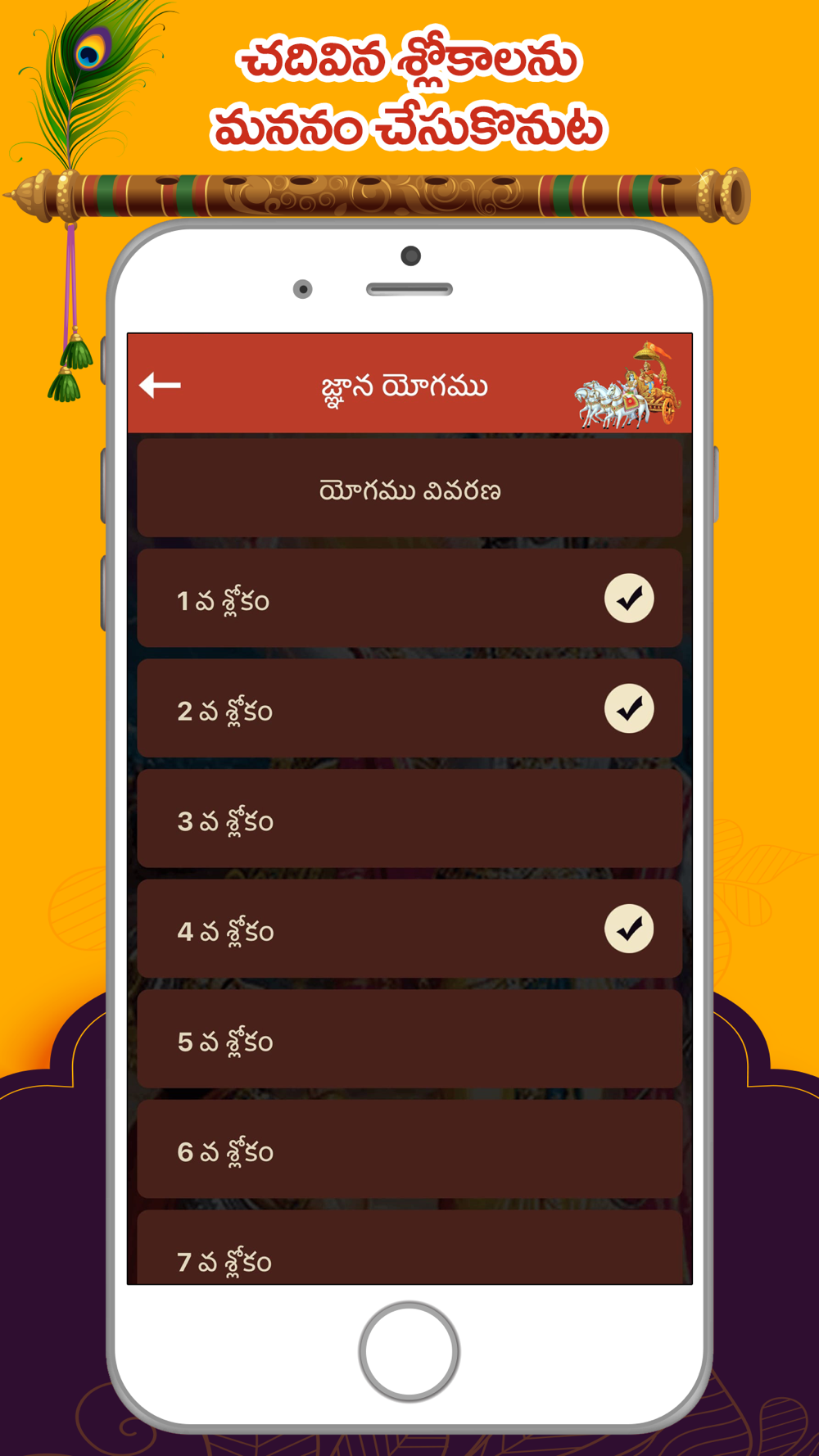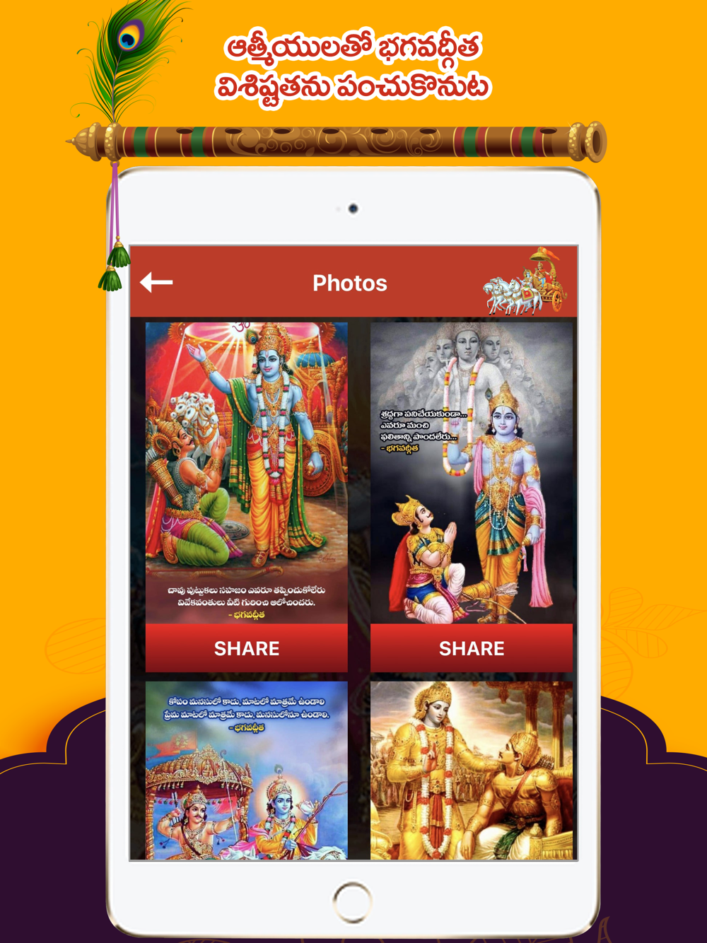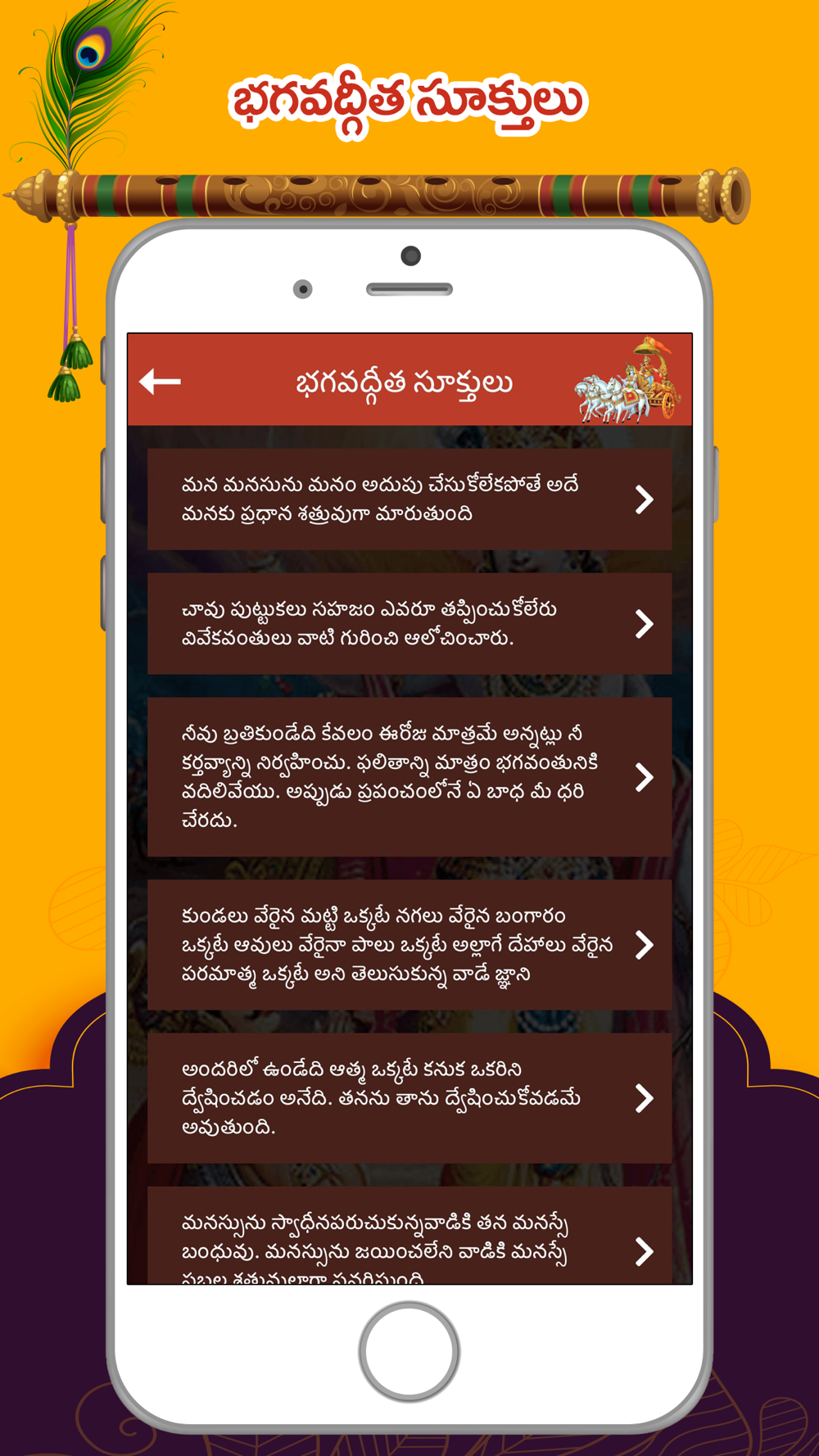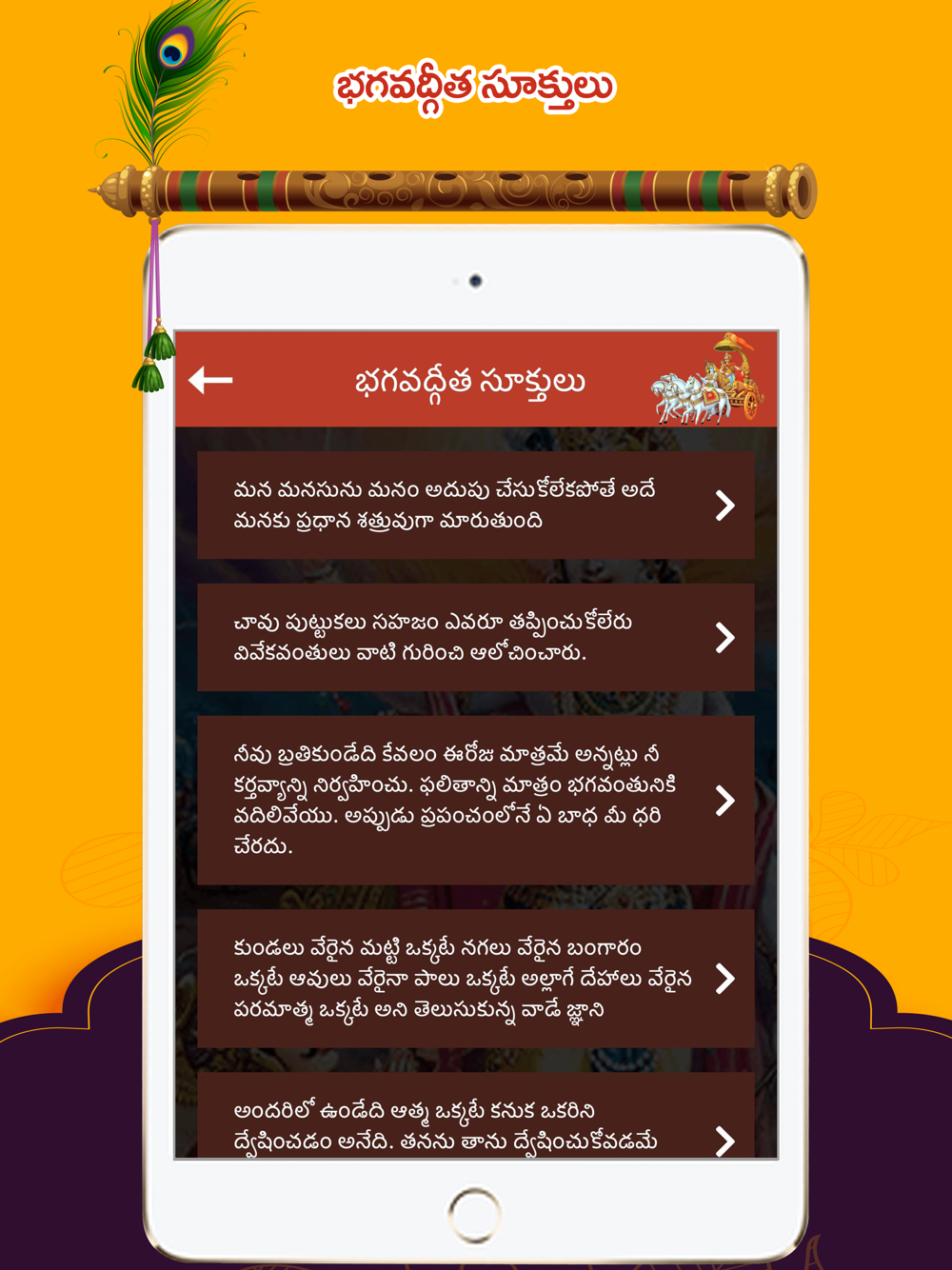 This Bhagavad Gita contains all 18 chapters with slokas with vivarana, Gita saramsam, sri krishnuni jananam, Sri krishna slokas and astotharamulu.