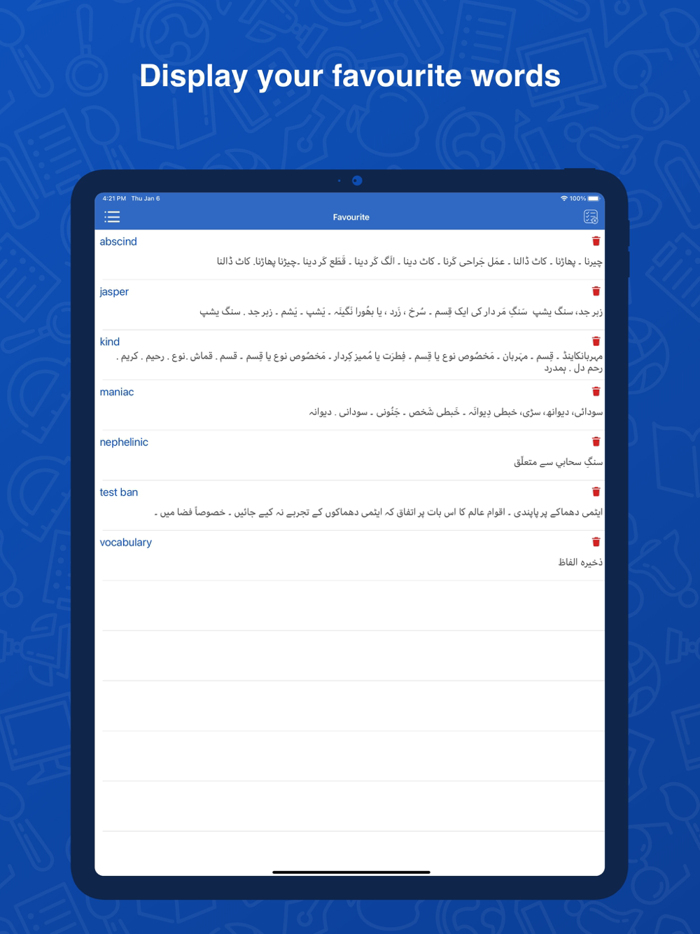 4- In our Urdu dictionary and translator app, users can search over 50000+ words to convert English to Urdu and Urdu to English.
