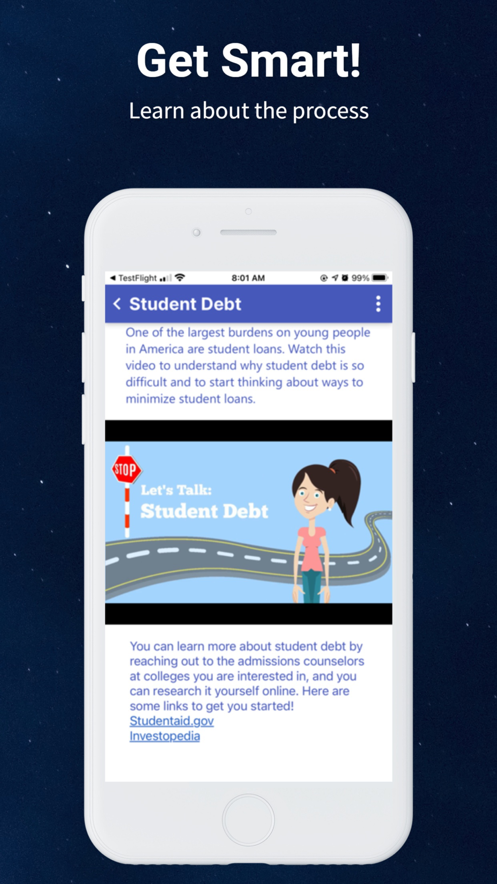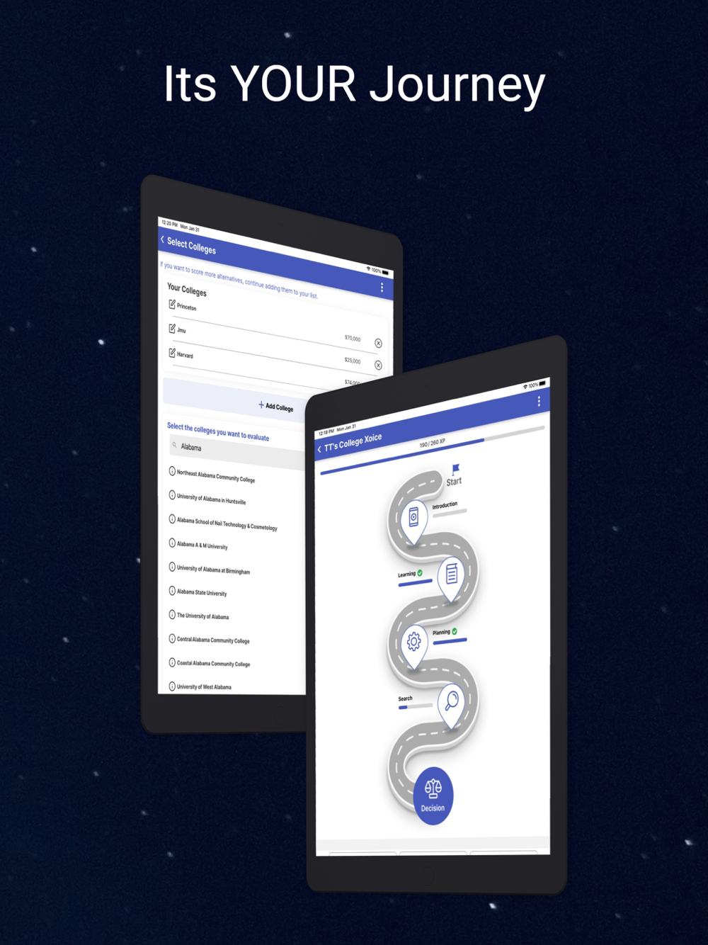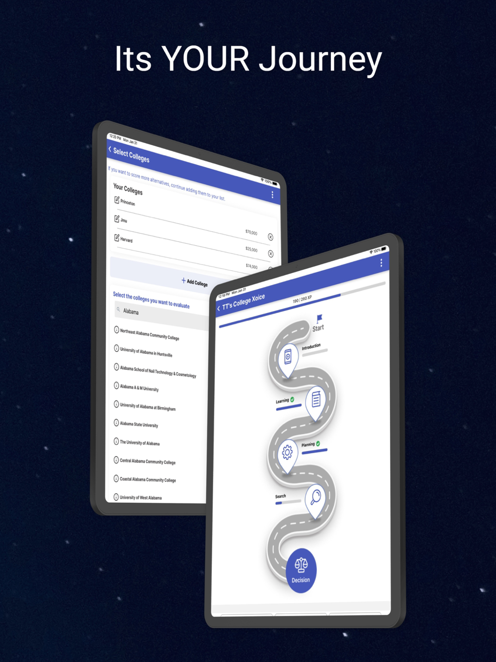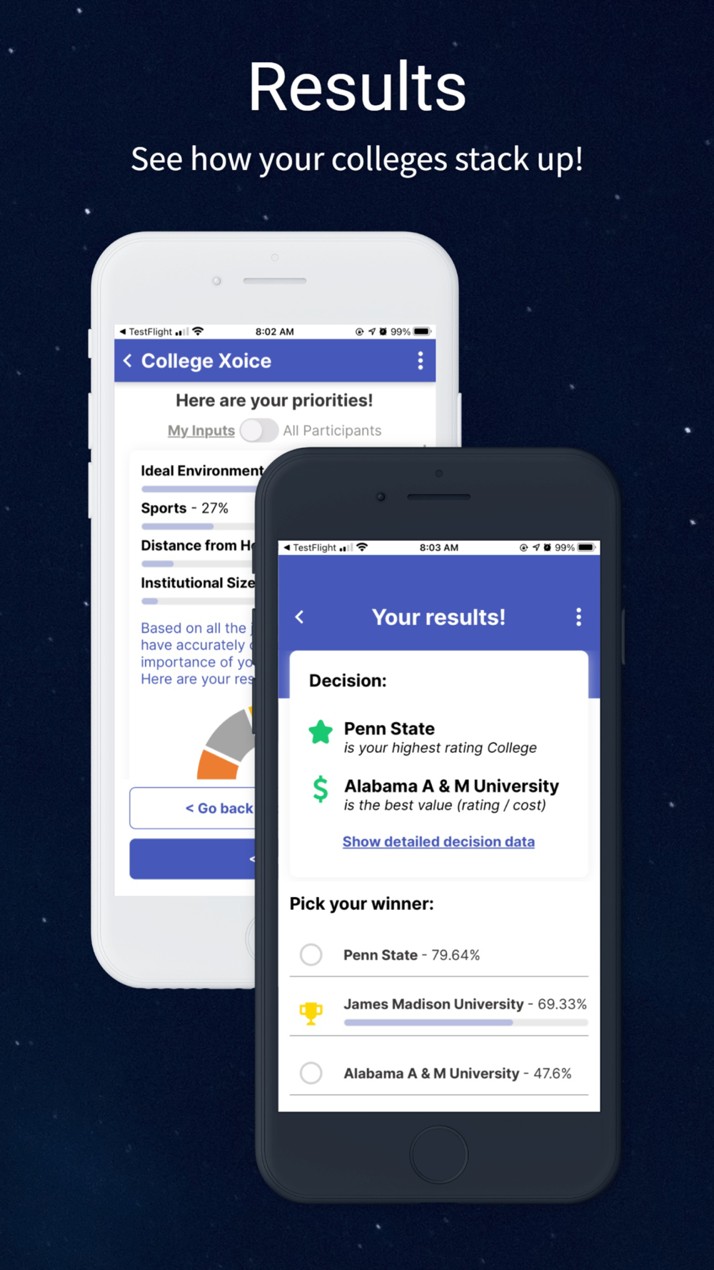 College Xoice allows prospective college students to explore their options. The app combines leading concepts in decision making with a fun learning experience. It focuses on teaching students the key elements to making college decisions and provides thought provoking criteria that the students may use to determine the best college fit. The app leads the student through the process of defining their unique decision model and then applying it to the schools they are evaluating. The student may invite others to participate in the decision and the reporting recommends the best decision.