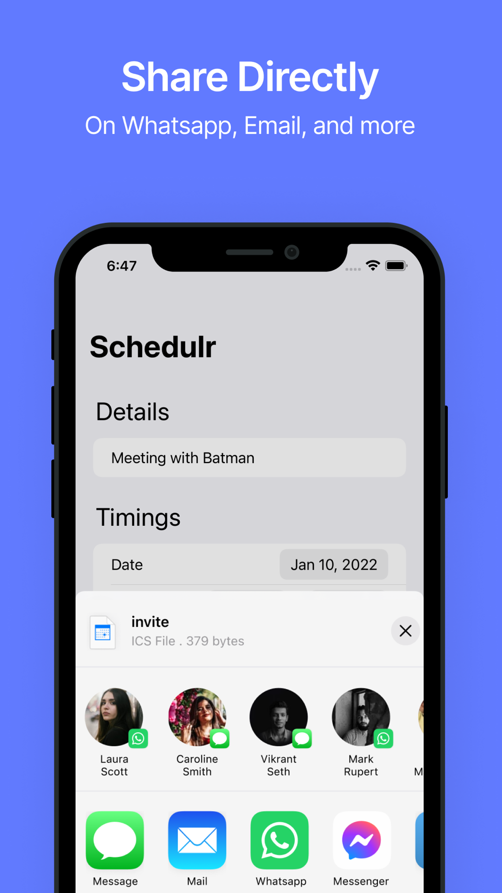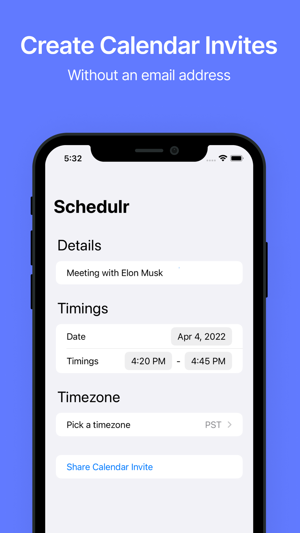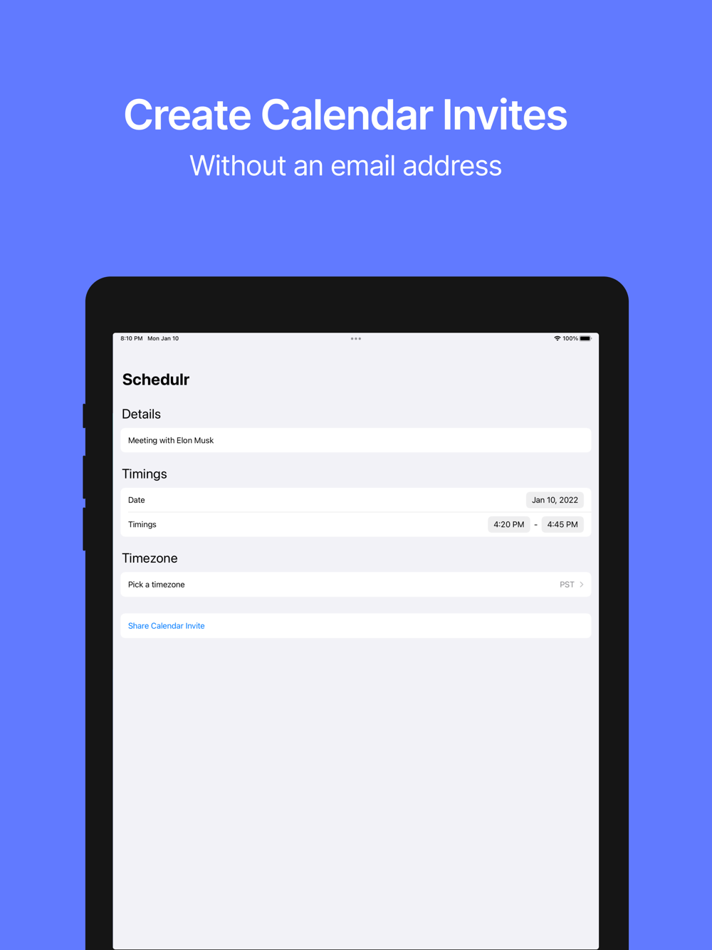 Schedulr is an app for scheduling calls without email. You can now generate and share calendar invites directly without needing an email address.