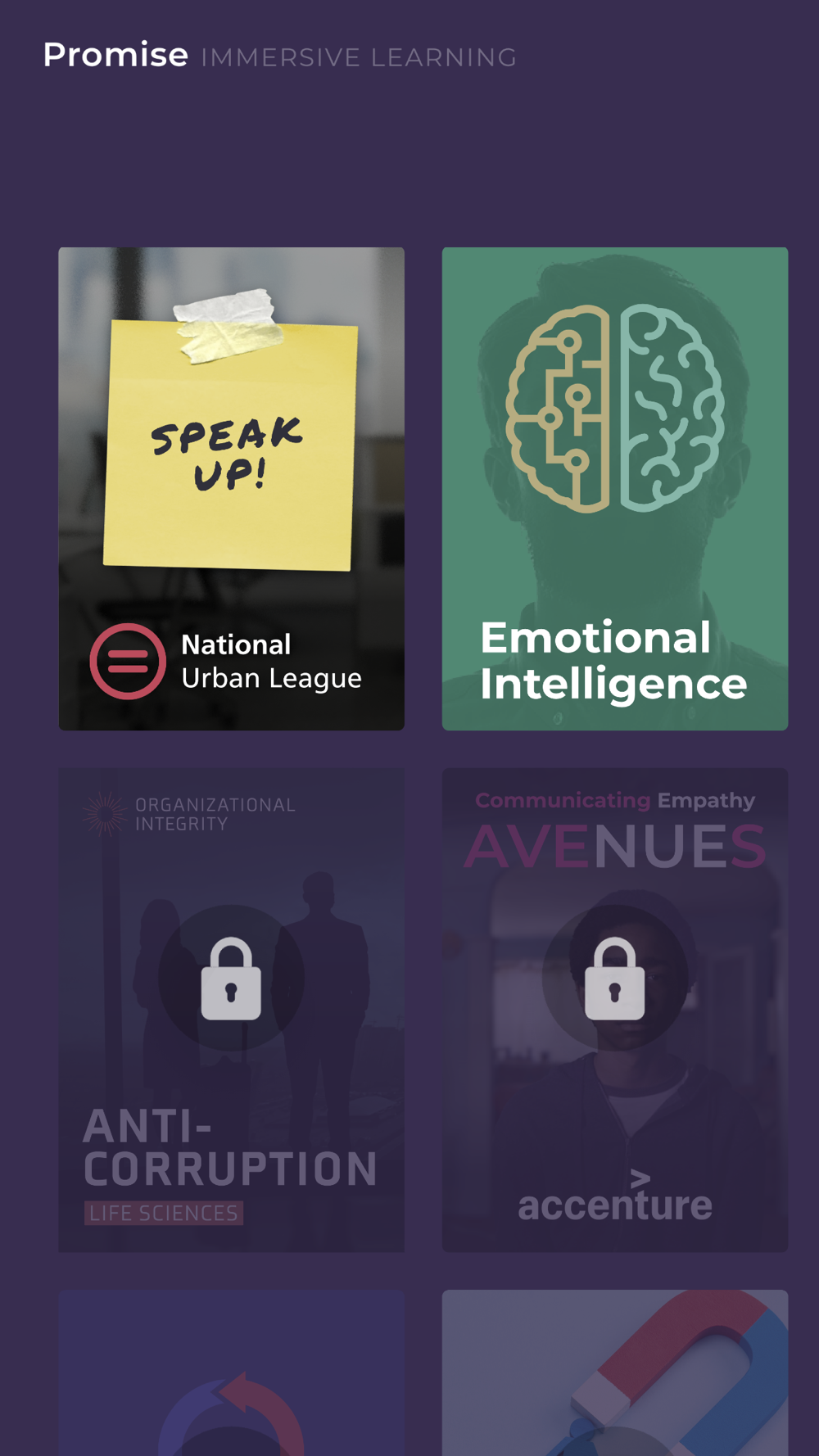 Promise is a place where you can find the best in immersive learning created by world leading thought leaders and institutions including National Urban League and SHRM. Powered by natural language processing, these experiences allow you to use your voice to practice navigating complex workplace scenarios. Based on your words, characters will respond with enlightening responses that show you that your words are powerful. The library encompasses many topics on people development, which includes the National Urban League’s Diversity, Equity & Inclusion series, Women in Leadership, Emotional Intelligence, Critical Thinking, High Performing Teams and Operational Integrity.