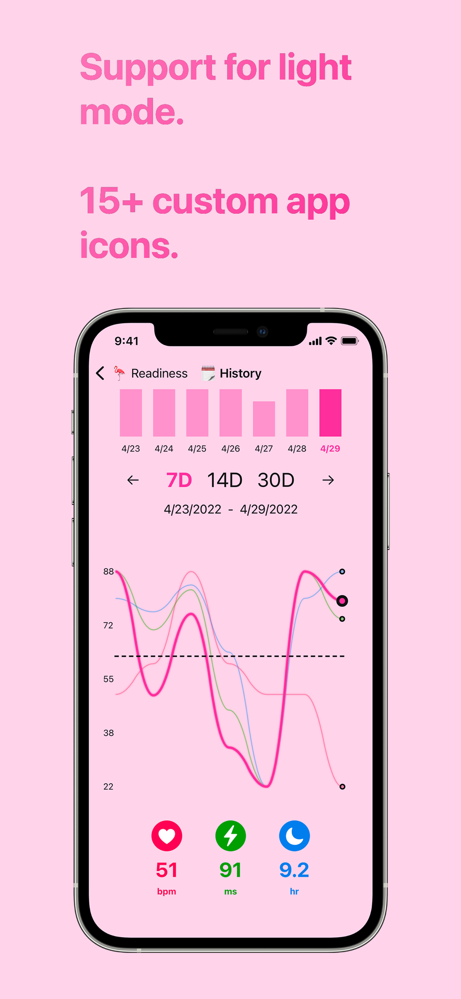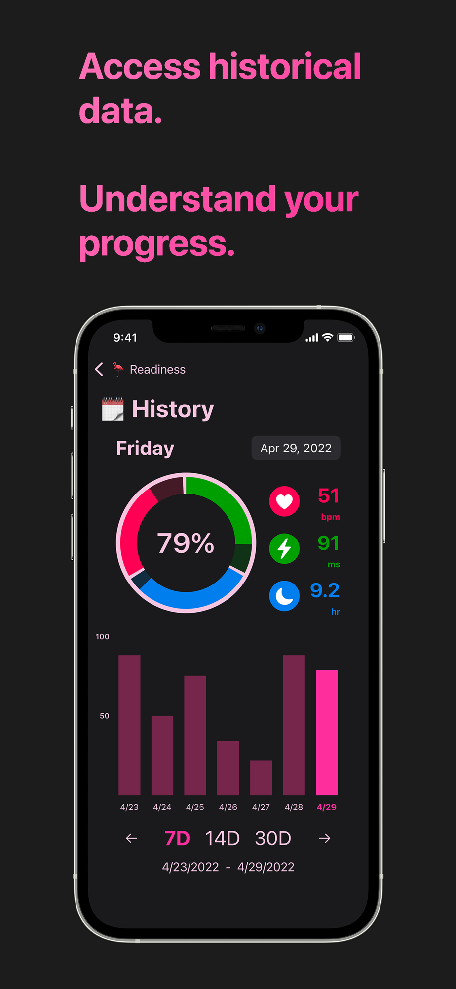 Flamingo is a health and wellness app that integrates with HealthKit data to track metrics specific to your unique heart rate and sleep schedule. Using data automatically captured from the Health app by your Apple Watch device, Flamingo generates a personal readiness score every day that can help you stay informed about your mental and physical state of readiness.