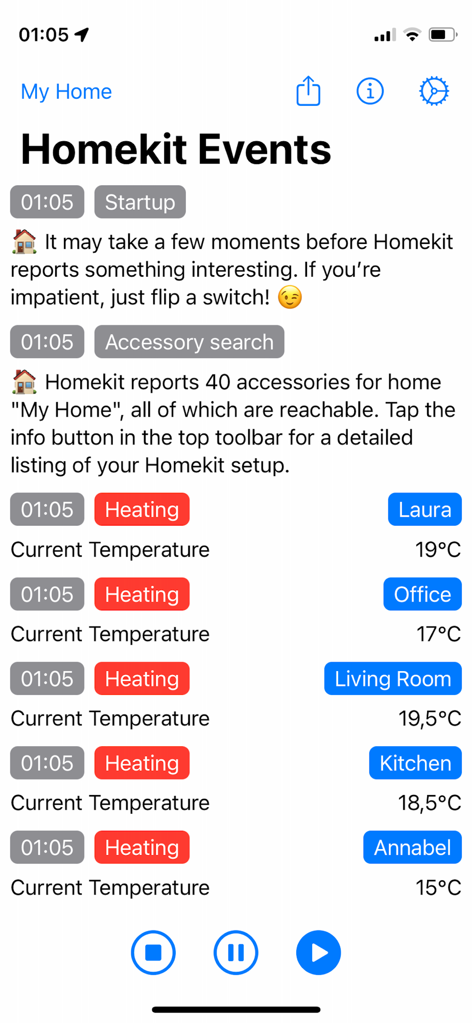 HomePeek shows you a torrent of communications, going on in your HomeKit network. You can save the log for later inspection. HomePeek will even log when it’s in the background (i. e. not the active application), although you can switch that off because it can put a strain on the battery.