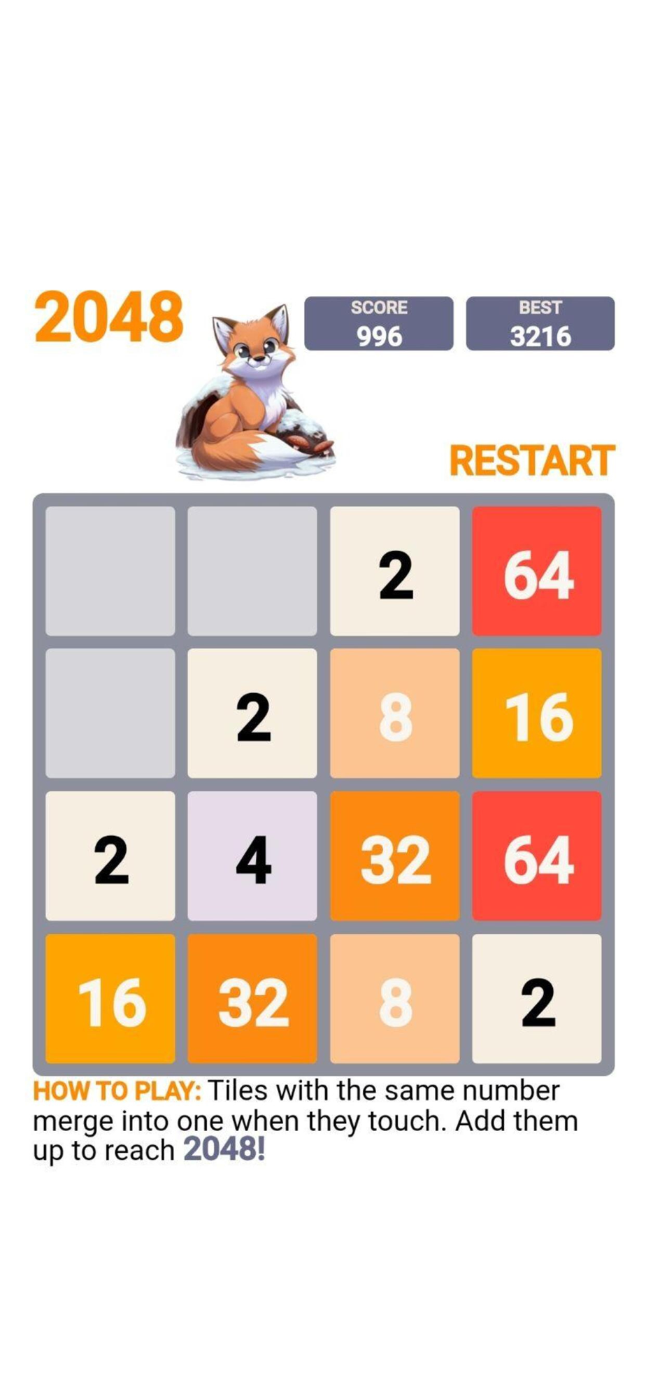2048 Fox is a simple logic puzzle game that is difficult to complete. It will help you to relax and have a good time.