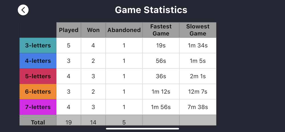 * A Word-a-day mode where everybody gets the same word for 24 hours. You can play against your friends and see who guesses the words the fastest or in the least number of guesses. (Currently only 3 character to 5 character words ... but more coming.)