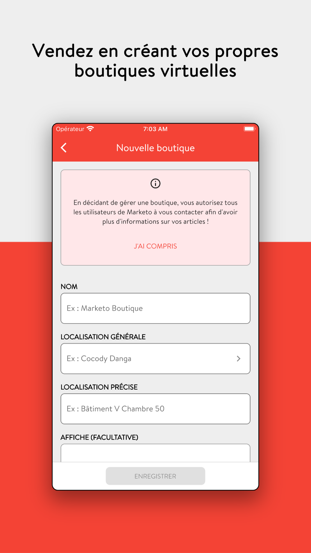Marketo est une application e-commerce gratuite qui permet d'acheter des articles à de très bons prix. L'application donne la possibilité aux commerçants de vendre leurs produits en ligne en créant un nombre illimité de boutiques ainsi qu'un nombre illimité de produits (il n'y a rien à payer pour créer sa boutique et y déposer des articles).