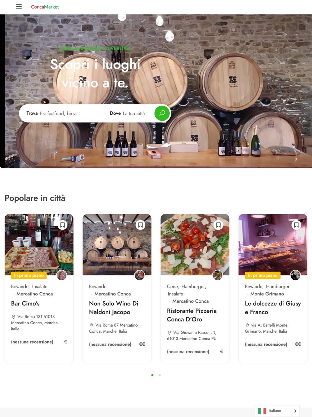 Siamo il mercato numero 1 di Mercatino Conca. Scopri bar, negozi, ristoranti, servizi e attività nella nostra zona. Ordina il tuo servizio e vieni a ritirare i tuoi prodotti presso la nostra sede e, naturalmente, se lo desideri, ordina i tuoi prodotti e scegli la consegna e noi verremo a consegnare il tuo ordine proprio davanti alla tua porta.