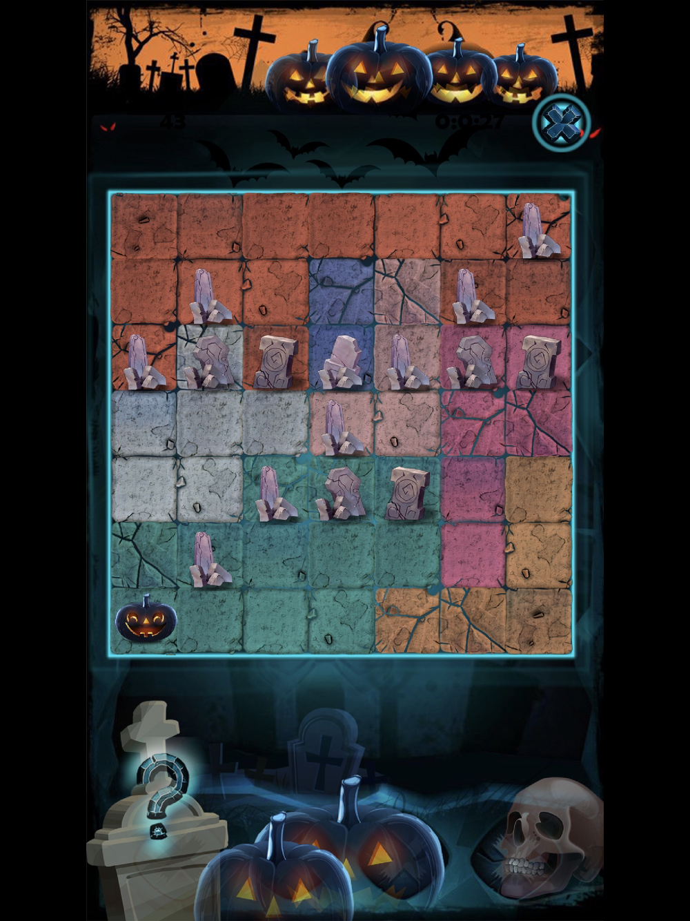The player's goal is to determine the proper positions for the jack-o'-lanterns on a square board following a set of rules.