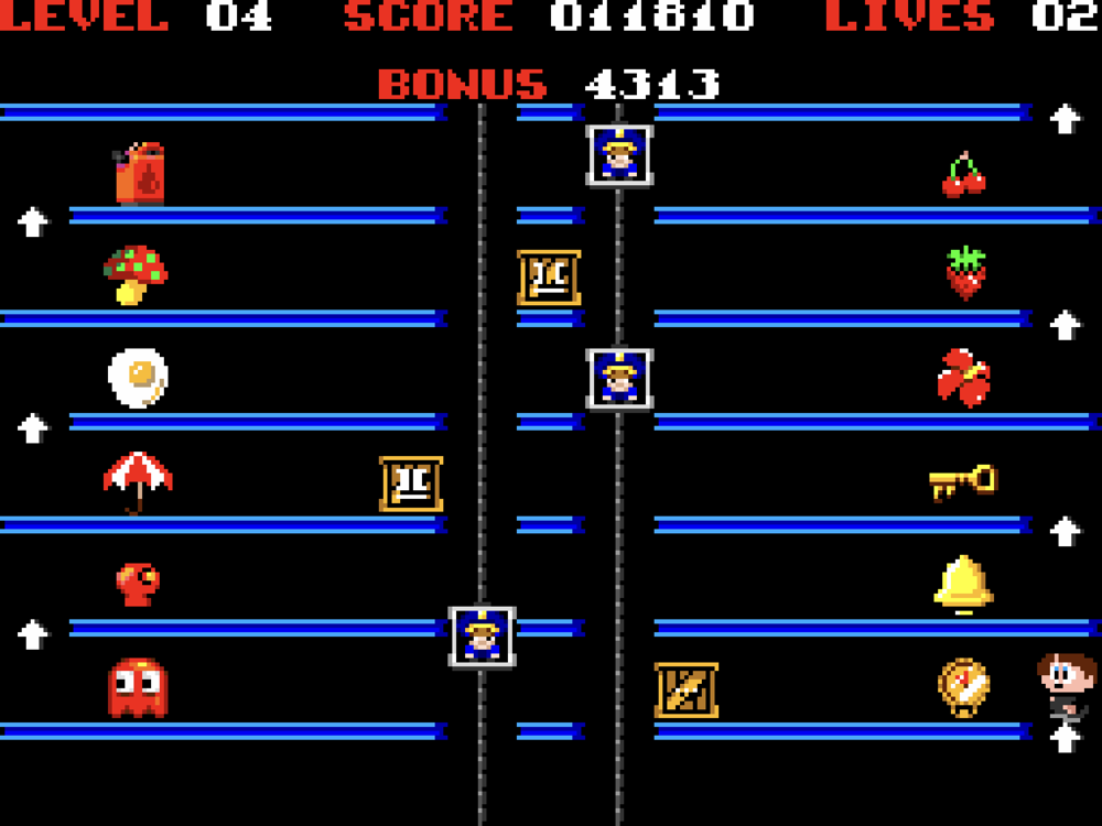 Nifty Lifty is a simple game. The player must collect various items such as hearts, small toys, tanks, umbrellas, and climb up while avoiding dangerous lifts going up and down. Each contact with a lift results in a loss of life. The character is controlled by tapping either side of the screen to move left and right. When the edge of the screen is reached, where the arrow is, the game automatically moves the character to the upper floor. A time bonus is provided for completing levels quickly.