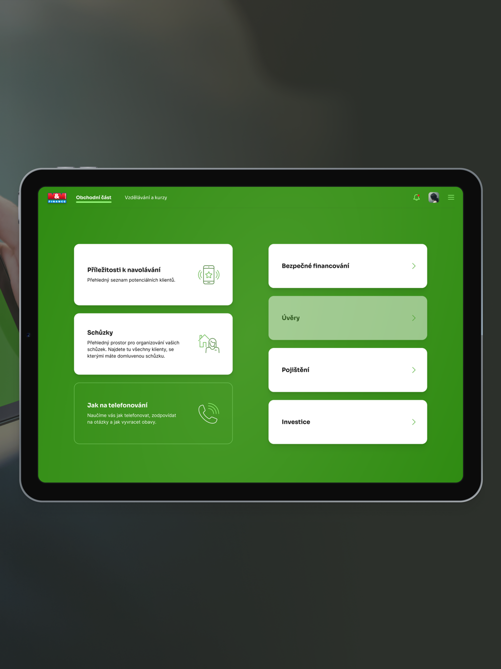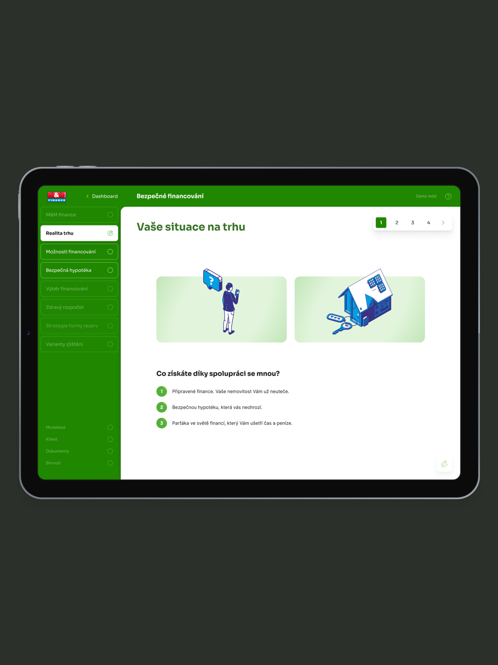 Aplikace je určena pro finanční poradce společnosti M&M Reality Holding. V aplikaci je možné provést klienta celým procesem sjednání finančního produktu.