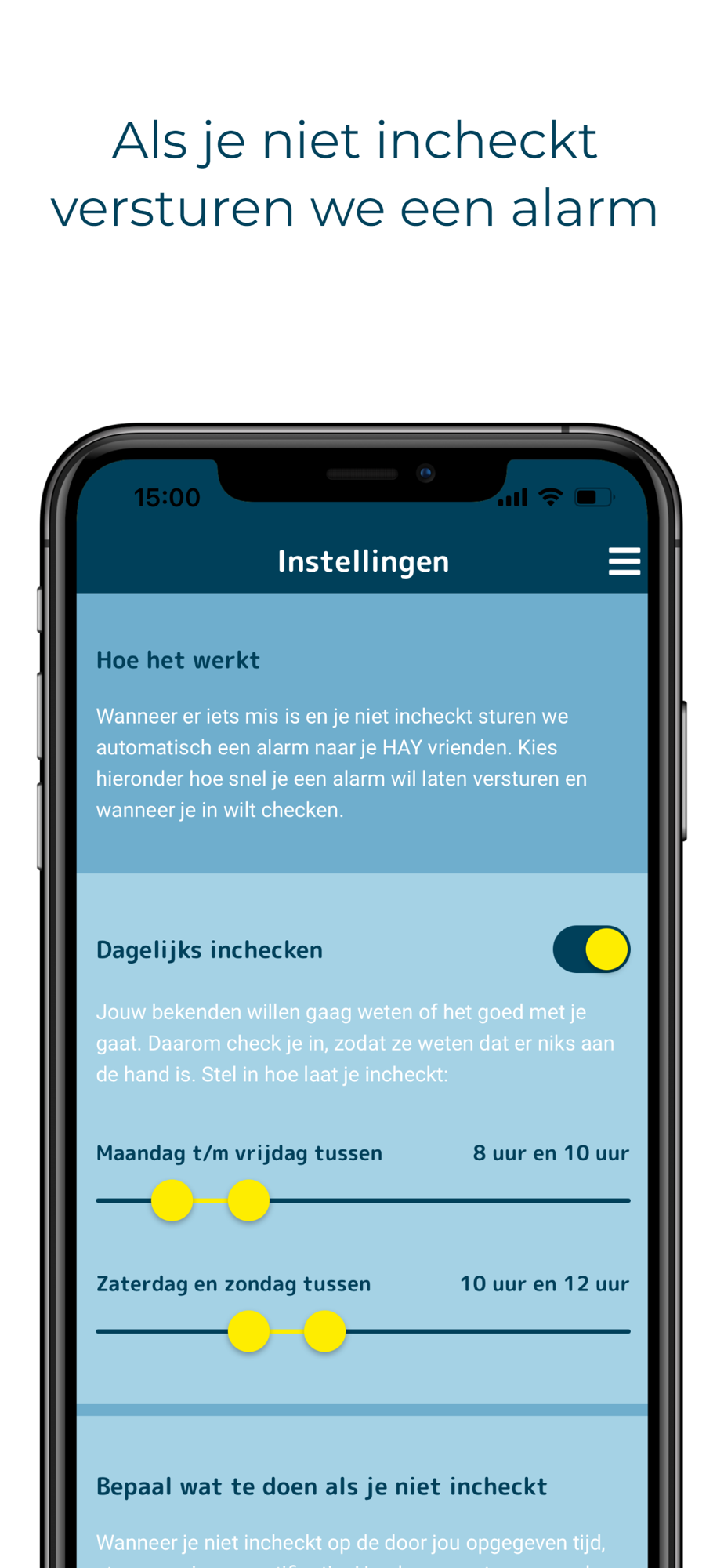 Je stelt zelf in hoe en wanneer jij wilt dat HAY – vrienden worden ingeschakeld. Dit kan zijn door in te stellen dat je op een vast tijdstip incheckt via de popup die je ontvangt. Als je niet incheckt krijg je eerst een melding op je eigen telefoon met het verzoek om in te checken. Als je niet reageert op deze melding gaat er een melding naar je HAY – vrienden. Je kunt zelf instellen hoeveel tijd er mag verstrijken voordat je HAY – vrienden een bericht krijgen dat je niet hebt ingecheckt.