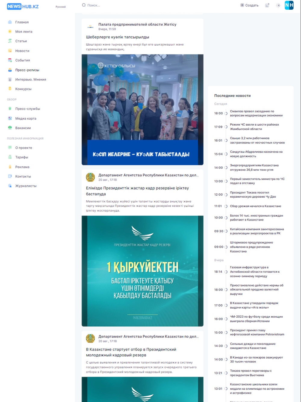 Информационный хаб «NewsHub.kz» предоставляет возможность организациям открыть виртуальные кабинеты пресс-секретарей, где они могут публиковать пресс-релизы, новостные материалы и другую информацию, которая будет доступна зарегистрированным журналистам.