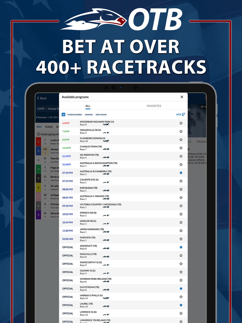 OffTrackBetting.com (OTB) Horse Racing Betting App is U.S. Based, Licensed & Regulated. Open a Free OTB Account to start watching and wagering online within minutes.