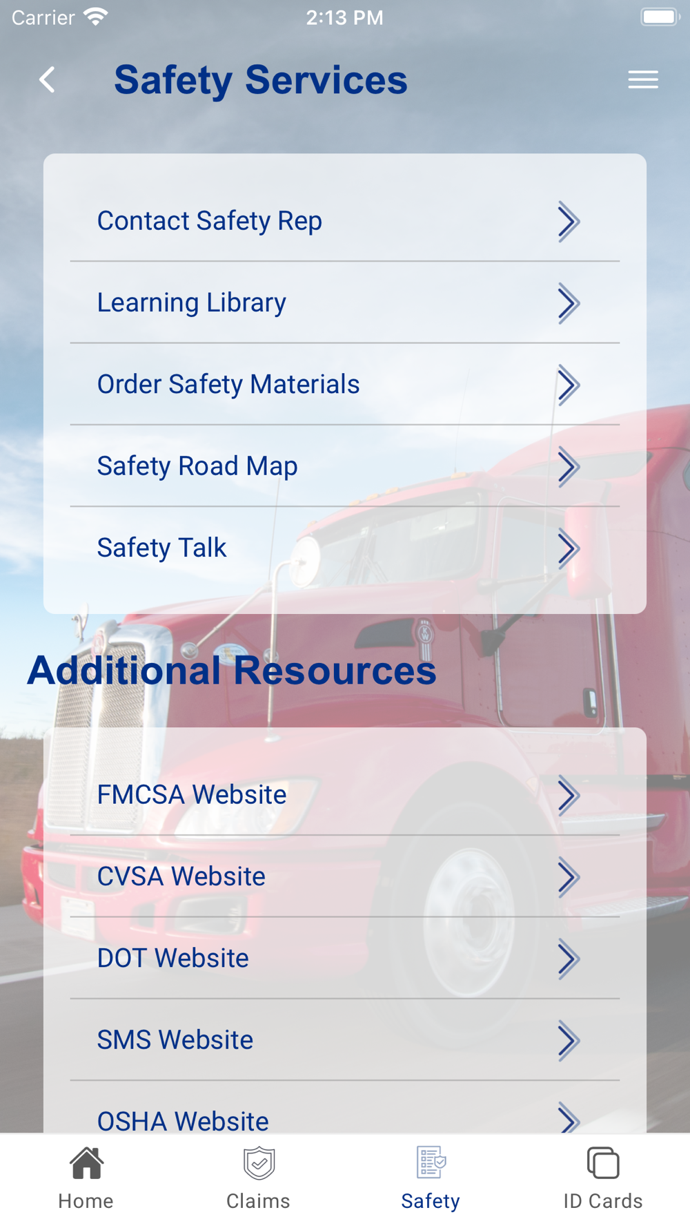 Information about your policy is available in the app, including coverages, deductibles, driver lists and equipment details. You can also view ID cards, print a certificate of liability, contact your agent, and report an accident.