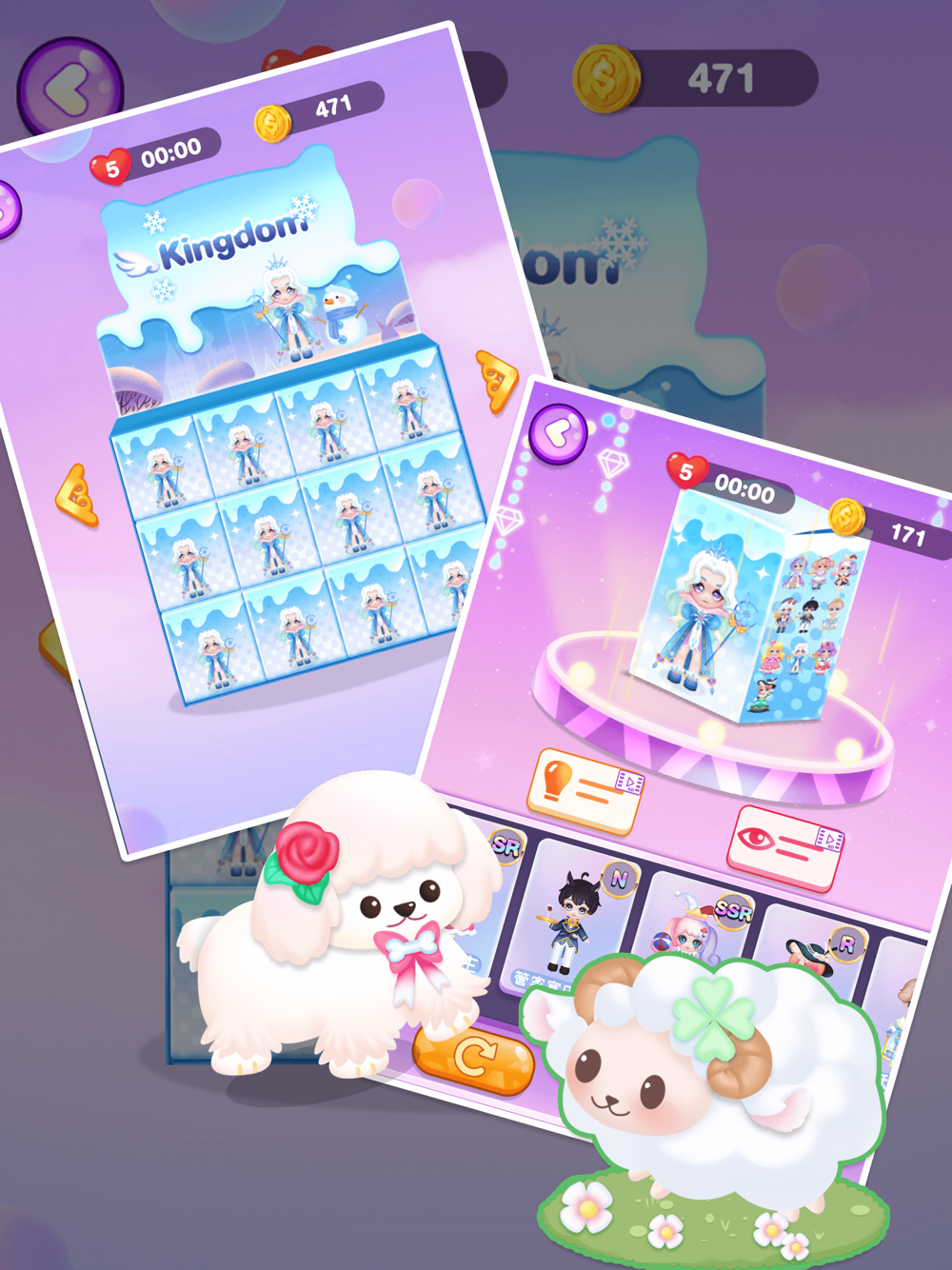 In the magic world, there are doll characters of different camps, such as chef & swordsman in the human kingdom, the ice queen in the elf kingdom, the devil in the dark kingdom, etc.... By drawing cards, players can obtain doll characters with grades of N, R, SR, and SSR. Choose different characters for round battles and get more game props! Players can also get more game coin rewards and prop rewards by customizing doll characters and selling them on the shelves!