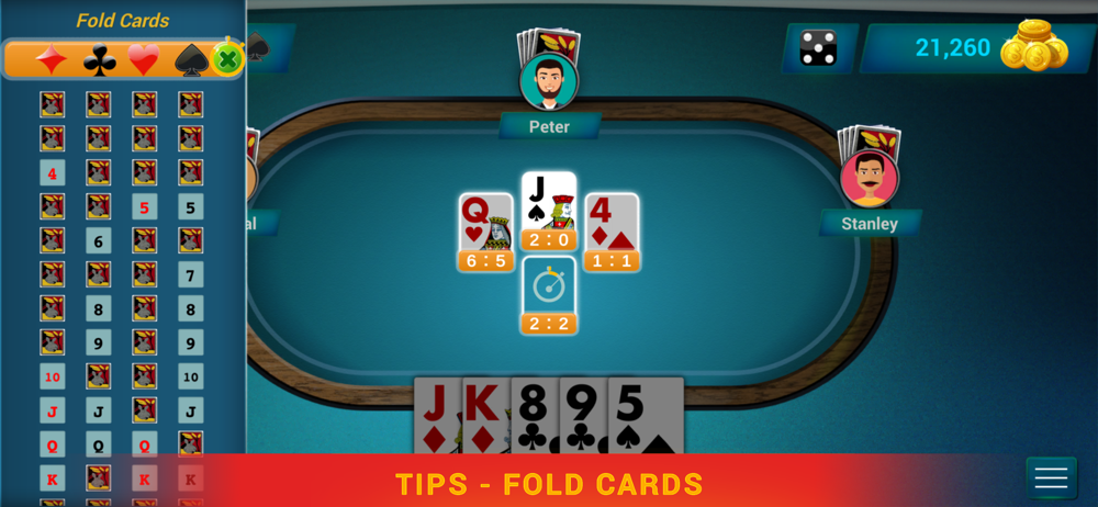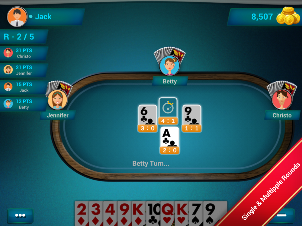 Call Break is a 4 players strategic multiplayer card game played with 52-deck of cards. Players are the dealer-- each player takes turns to deal the cards. It is a turn based game. The winner is decided after 5 rounds. The objective of the game is to get as many tricks (points) as possible in each round. You must follow suit and play the highest card to win a trick. And, SPADE is the trump suit of this tas game. A round starts once everyone gets 13 cards each and they “Call (Bid)” the number of tricks they can take in the round. The player with the maximum points at the end of the 5 rounds wins the game.