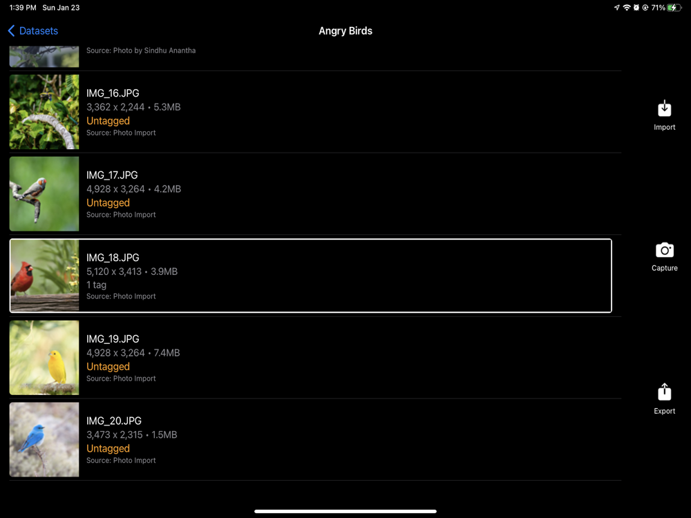 ・While browsing the images in a dataset, tap the "Capture" button to snap new images with the camera