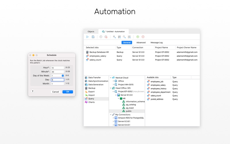 Use Import Wizard to transfer data into a database from diverse formats, or from ODBC after setting up a data source connection. Export data from tables, views, or query results to formats like Excel, Access, CSV and more. Add, modify, and delete records with our spreadsheet-like Grid View together with an array of data editing tools to facilitate your edits. Navicat gives you the tools you need to manage your data efficiently and ensure a smooth process.