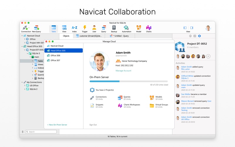 Navicat for SQLite is a powerful and comprehensive SQLite GUI that provides a complete set of functions for database management and development. Optimizing your SQLite workflow and productivity - you can quickly and securely create, organize, access, and share information.