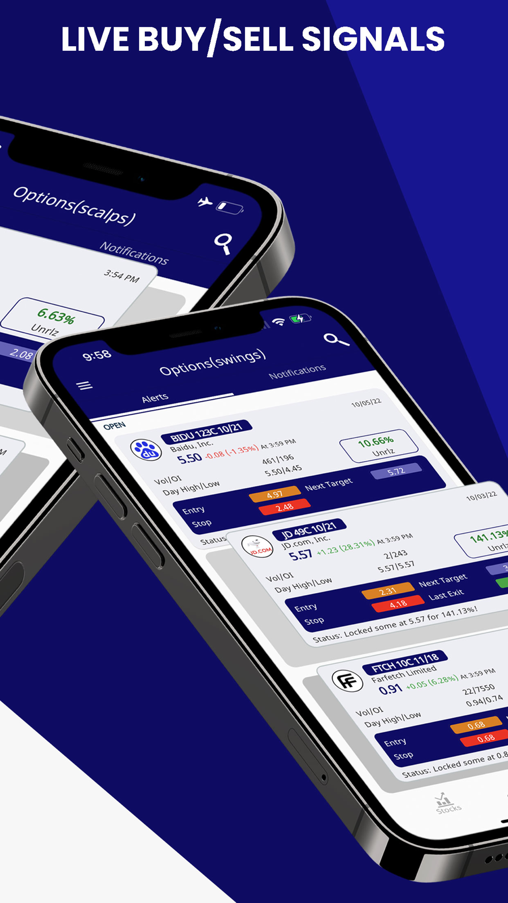 FLOW Trades app alerts you with real time options & stocks signals through push notifications. These include buy and sell recommendations based on market trend and option flows.