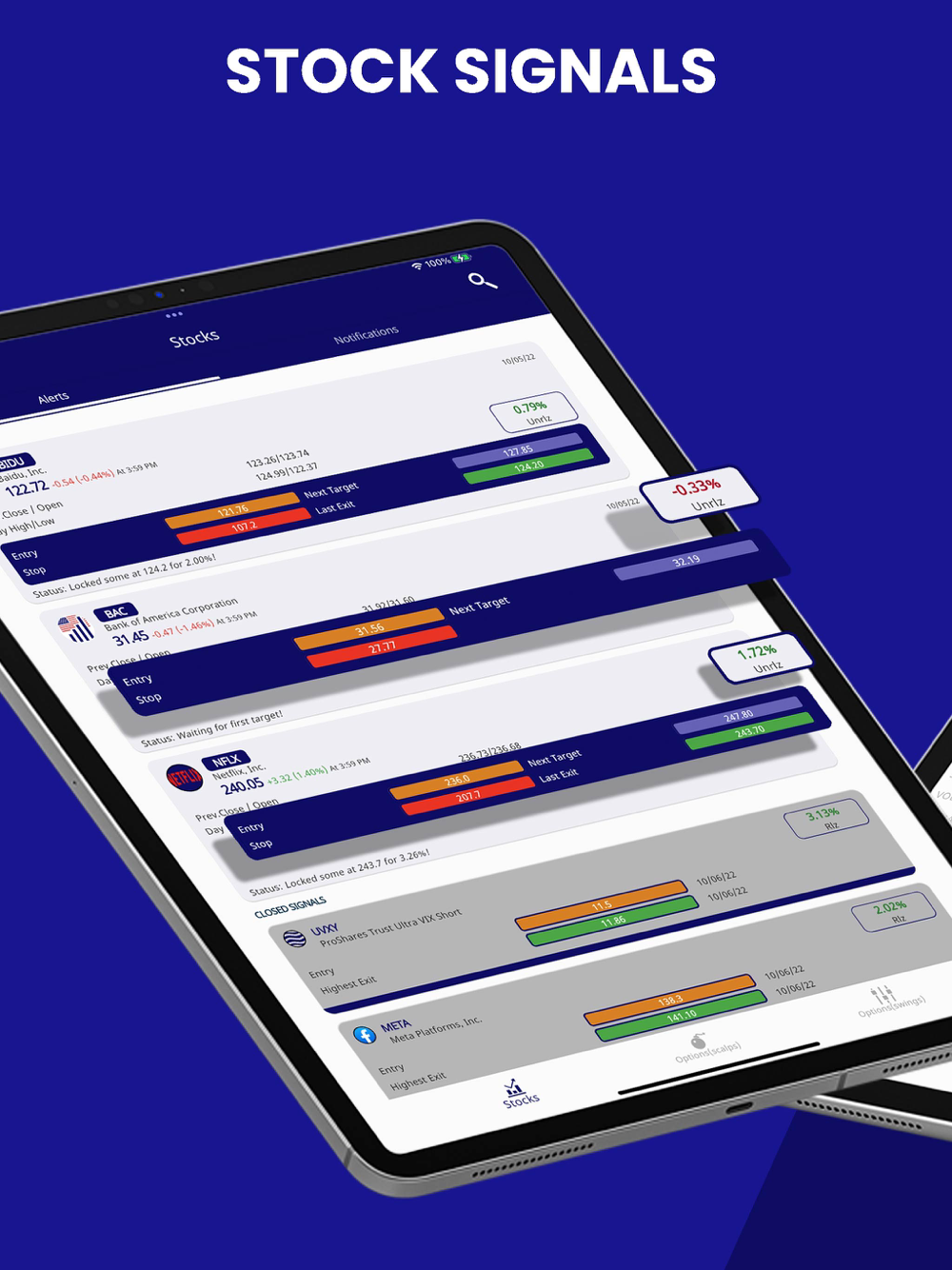 Each BUY alert include the Entry, Next Target and Stop Loss. After a target or stop loss has reached, the app sends another real time alert.