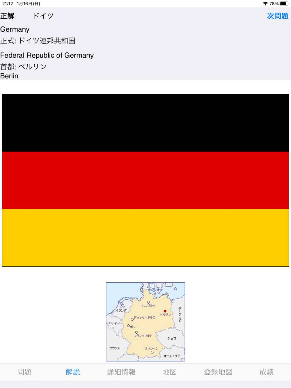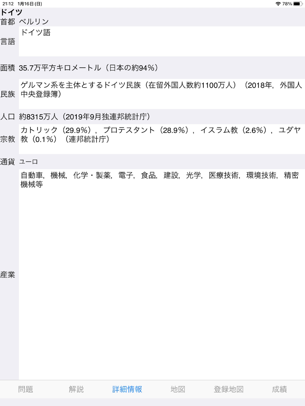正解の国の首都、言語、面積、民族、人口、宗教、通貨、産業が表示されます。