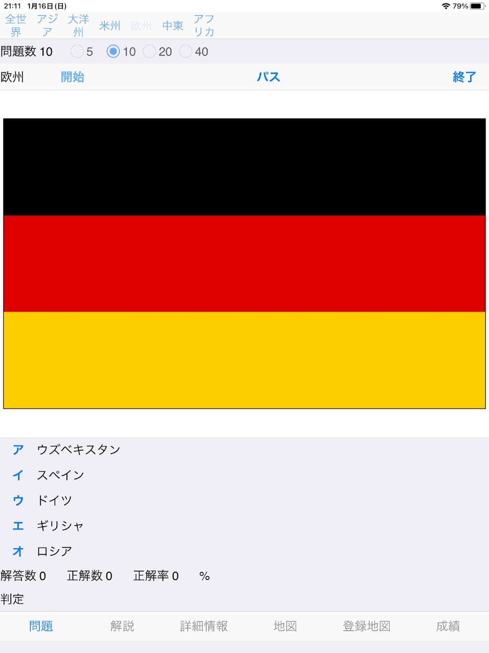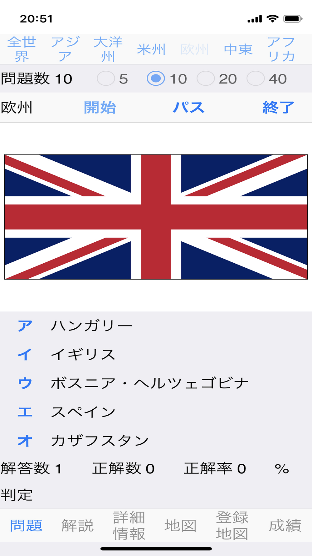 地域と問題数を選んで、[開始]をタッチすると、国旗と解答の選択肢が表示されます。