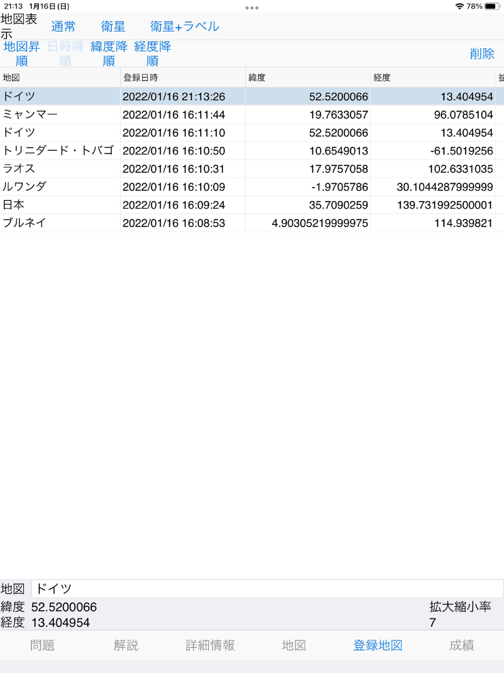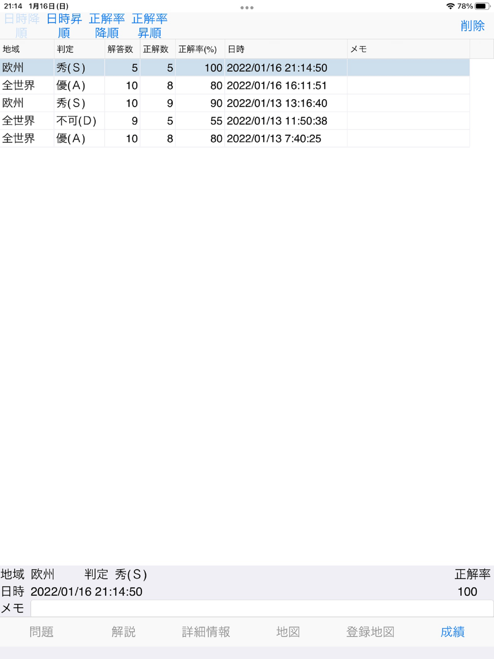 最後まで解答すると、判定結果が表示されます。成績のよい順に、秀(S)、優(A)、良(B)、可(C)、不可(D)となり、データベースに登録されます。正解率でソートすると不得意な地域がわかります。