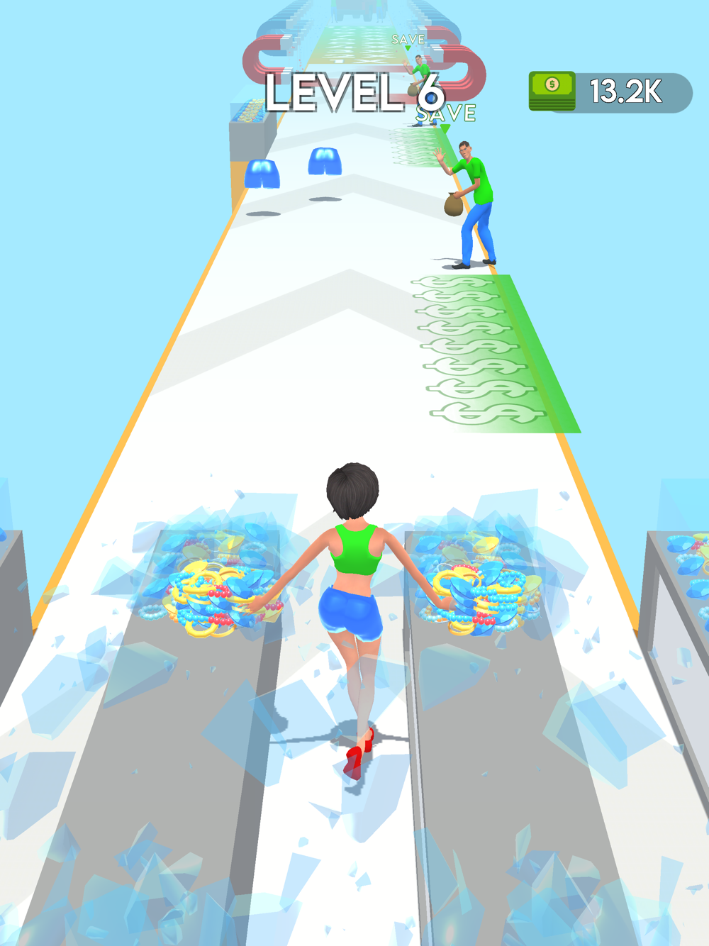 Collect all gems and avoid from security. Reach to your crew!