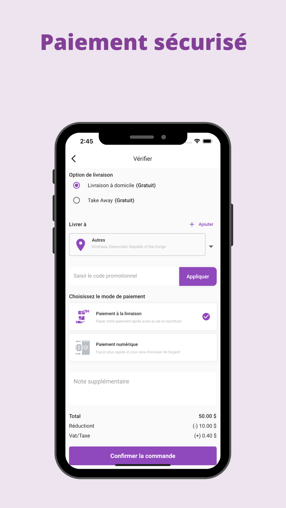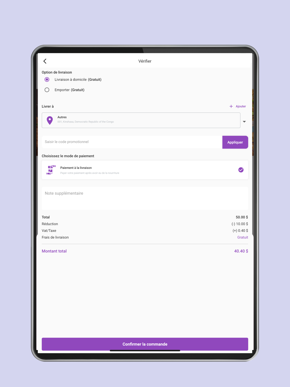 Sélectionnez votre emplacement et vous verrez les restaurants disponibles dans votre région pour passer votre commande, un délai de livraison estimé, les prix totaux et les taxes. Payez en toute sécurité avec votre portefeuille, votre carte de crédit ou payez à la livraison. Suivez votre commande en temps réel au fur et à mesure qu'elle se dirige vers vous.