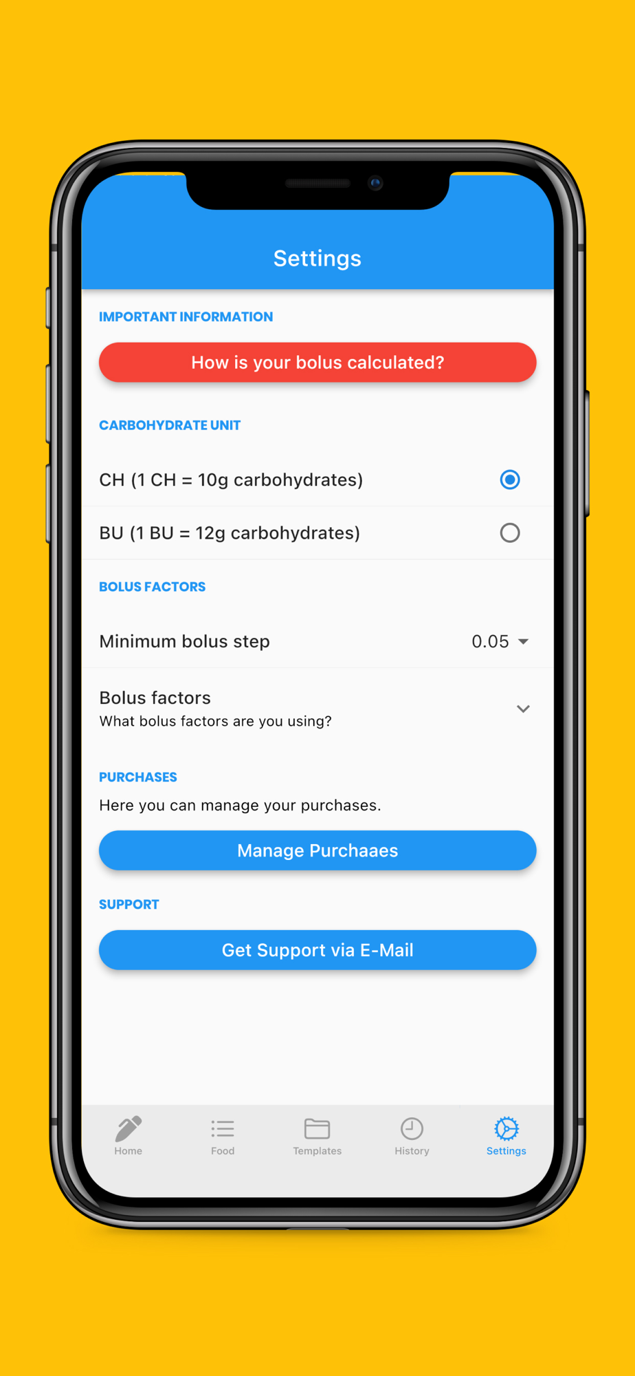 Let us help you calculate your bolus. With our app, it's easy to count your carbs and calculate the bolus for meals. Choose food, select amount, done! You can save your meals and use them as templates. The app knows tens of thousands of products and their carbohydrate content. Scan the EAN code or search for keywords! All product data is continuously updated.