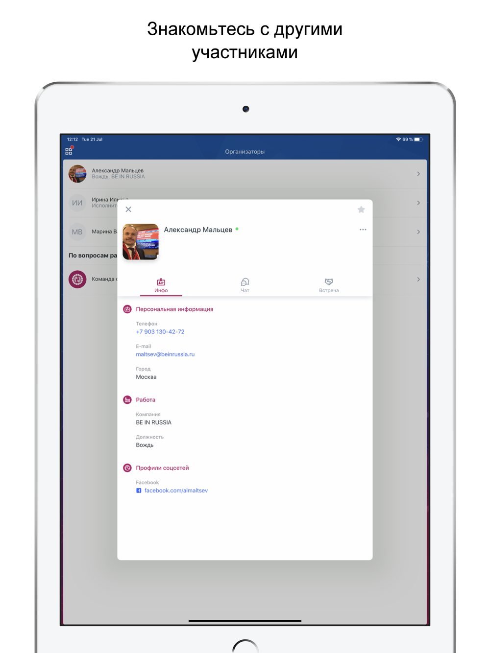 Официальное приложение для воркшопов и конференций BE IN RUSSIA. Вы можете: общаться on-line и назначать встречи с участниками коммуникационного проекта BE IN RUSSIA: MICE - поставщиками и MICE -заказчиками через приложение; обмениваться файлами, узнавать подробности докладов, задавать вопросы спикерам; получить доступ к загруженным материалам.