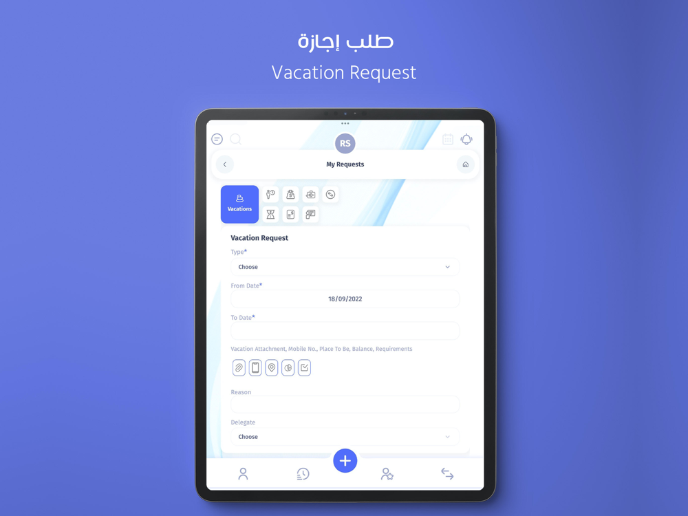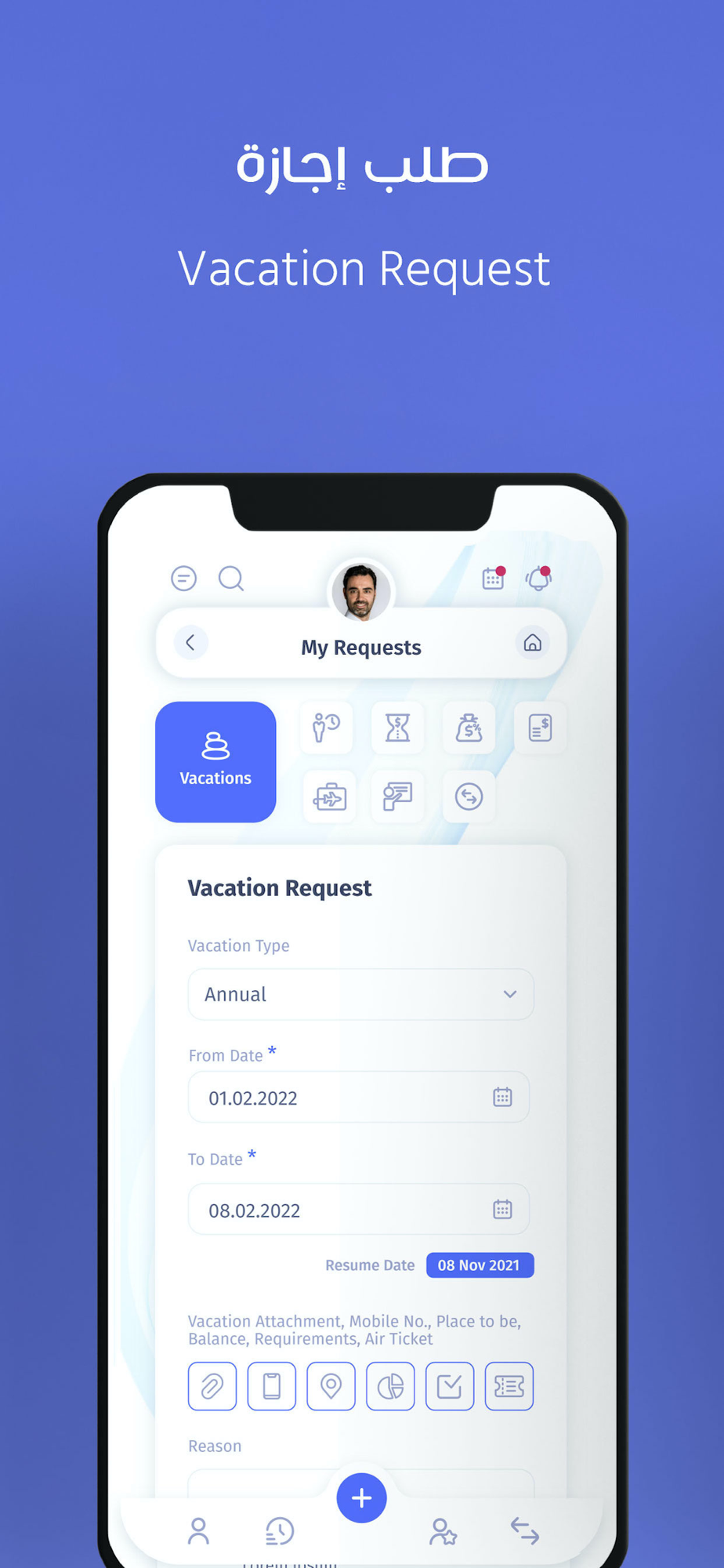 Enjoy the smooth navigation process with bold colors and informative icons that ensure real-time alignment and career development. Through interactive and accessible options, you will be able to synchronize different information and upload attachments, send vacation requests, manage attendance, and follow up or be notified on their progress throughout.