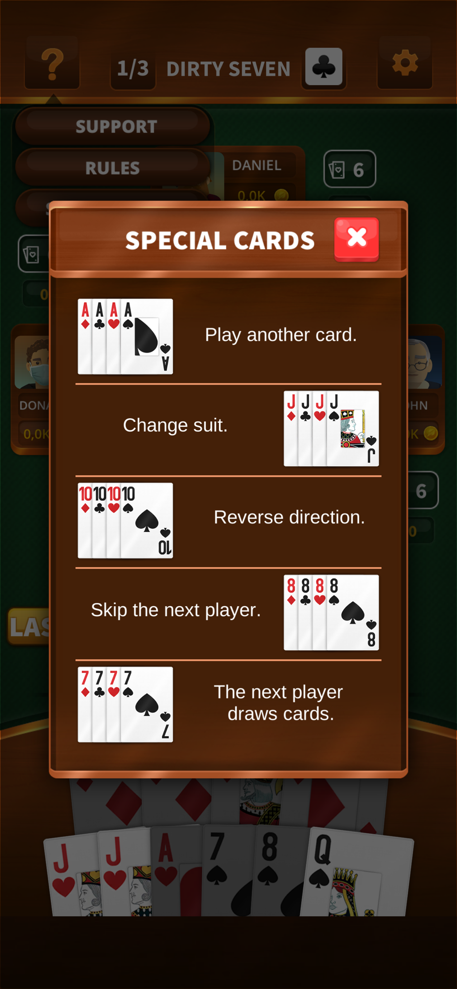Alper Games proudly presents Pis Yedili HD (Dirty Seven); a Turkish variant of Crazy Eights for four players. Two decks of cards are used to play the game. There is a huge number of variations of this game with many different rules. We hope that you’ll love our version the most