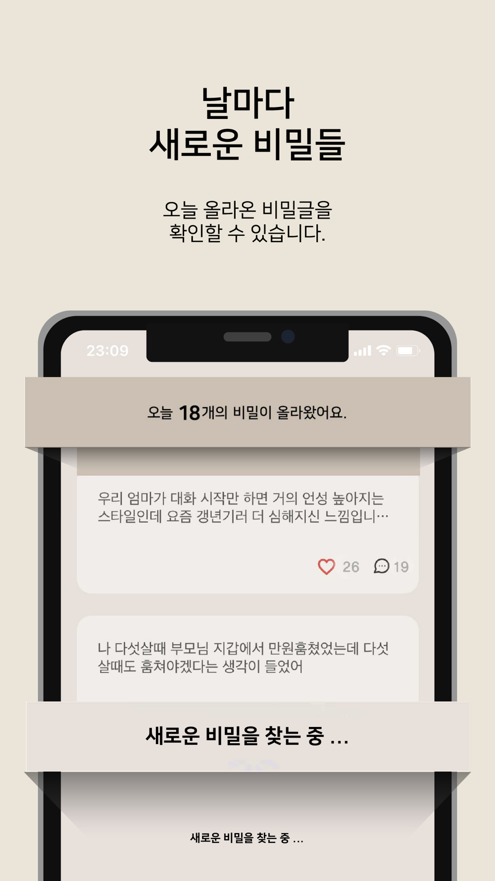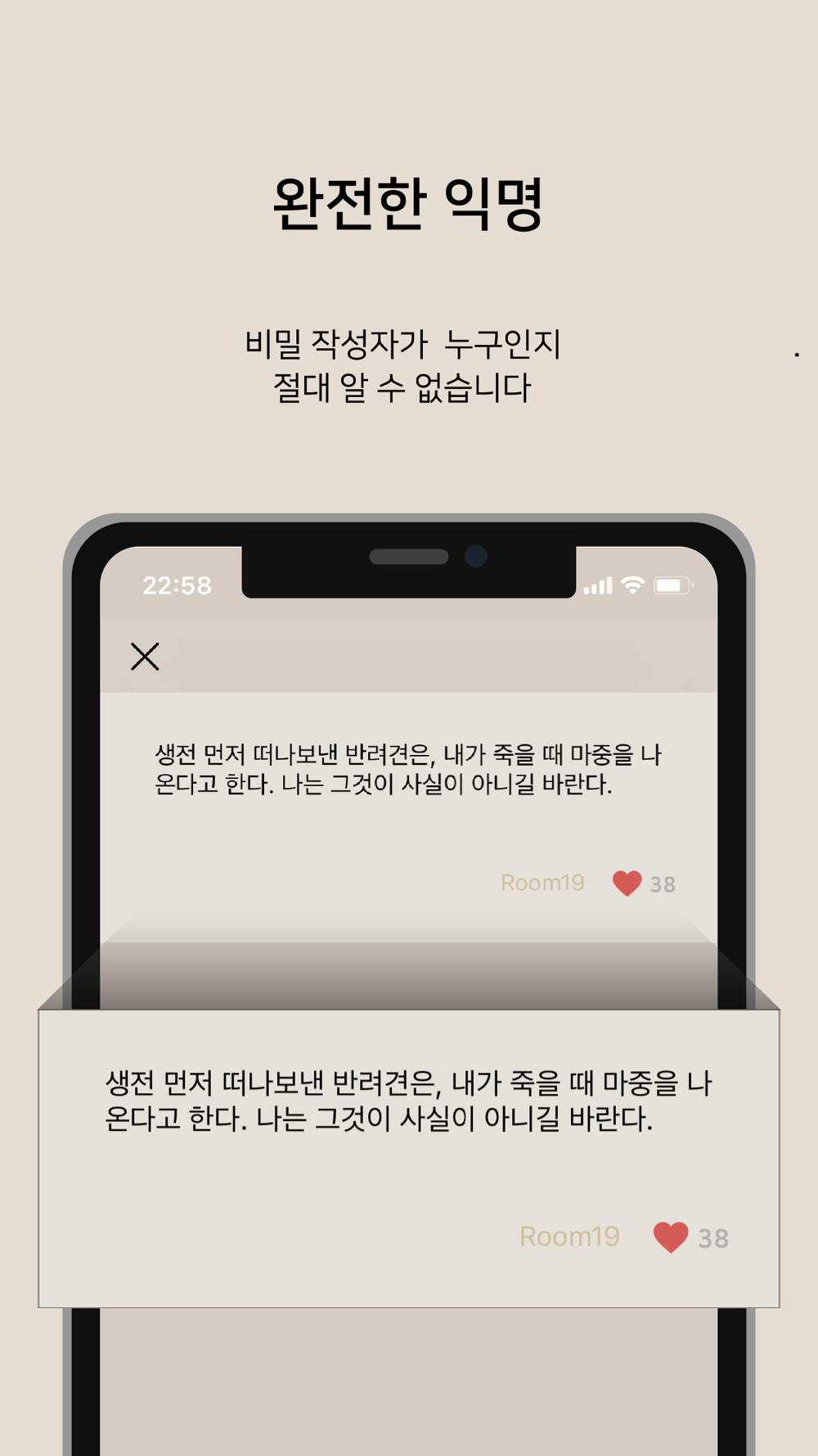 Room19은 자신의 비밀을 보관하고, 다른 사람들의 비밀을 엿볼 수 있는 완전 익명 커뮤니티입니다. 어떤 비밀이라도 속 편하게 털어놓을 수 있도록 그 어떤 개인정보도 노출되지 않습니다.