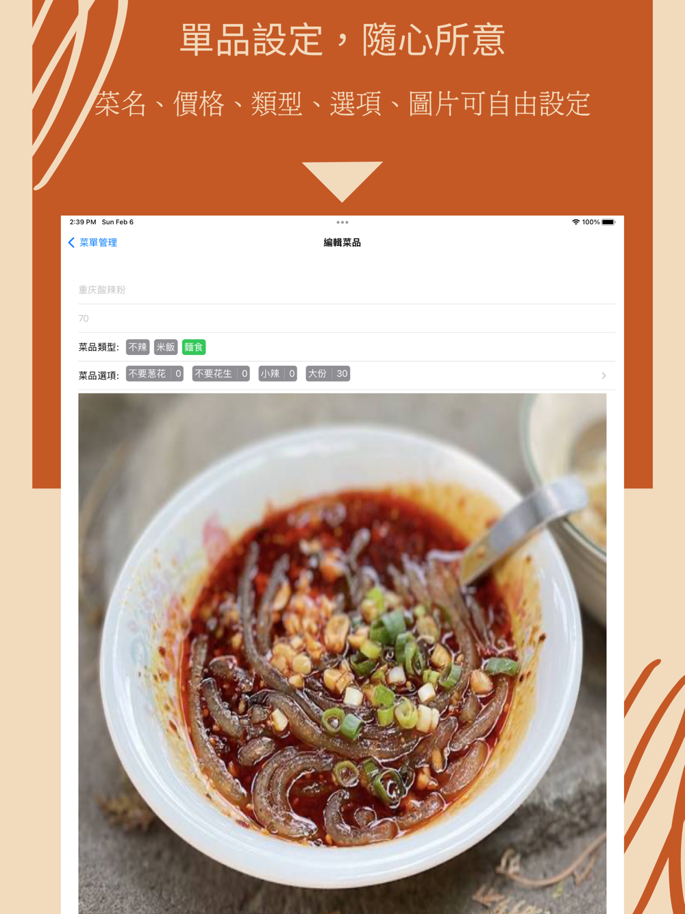極簡設計,操作一目了然。100%自助管理菜品分類,添加和編輯菜品。銷售統計功能,讓您輕鬆管理財務。可連結藍牙打印機打印訂單,用科技代替傳統手工寫單,清楚無誤。庫存管理系統,可自行設定當前餐點庫存量,賣一份減一份,庫存瞭如指掌。未來我們還會繼續增加新的功能(銷量預估、會員折扣系統、以及多UI美化和多外觀選擇)。