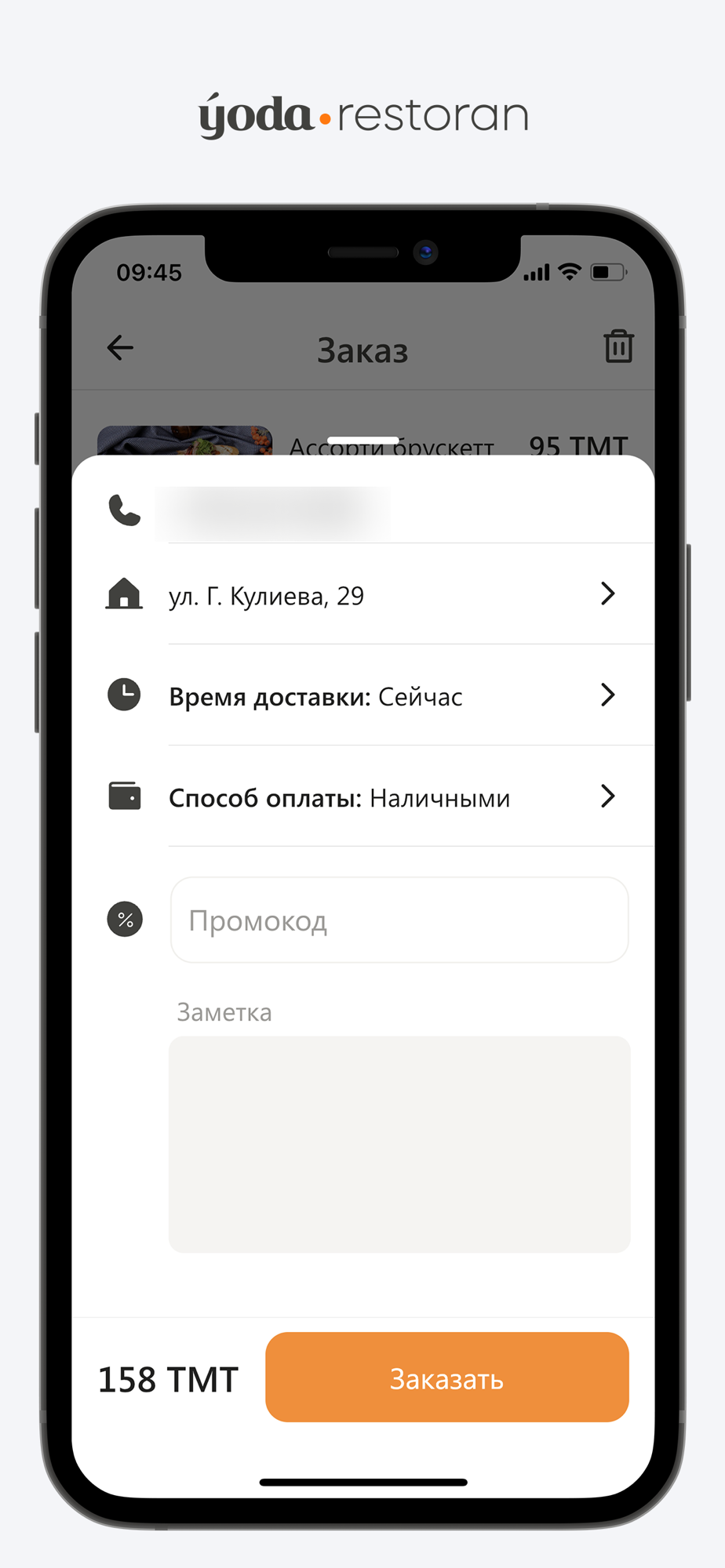 Ýoda Restoran — eltip bermek hyzmaty ýola goýlan restoranlary we kafeleri bir ýerde jemleýän onlaýn platforma. Saýlama restoranlar, aşhanalaryň dürli görnüşleri, ýokary hil, ýokary hyzmat, ulanmak üçin düşnükli interfeýs, sada we göze ýakymly dizaýn, öz maglumatlaryňy goşmak, sargydy iň aňsat usulda jemlemek we salgyňyza gelýänçä “ädimme-ädim” yzarlamak, tagamlar we hyzmat barada pikiriňi ýazmak, öýde nahar bişirmek endigini unutmak… bularyň hemmesi — Ýoda Restoran.
