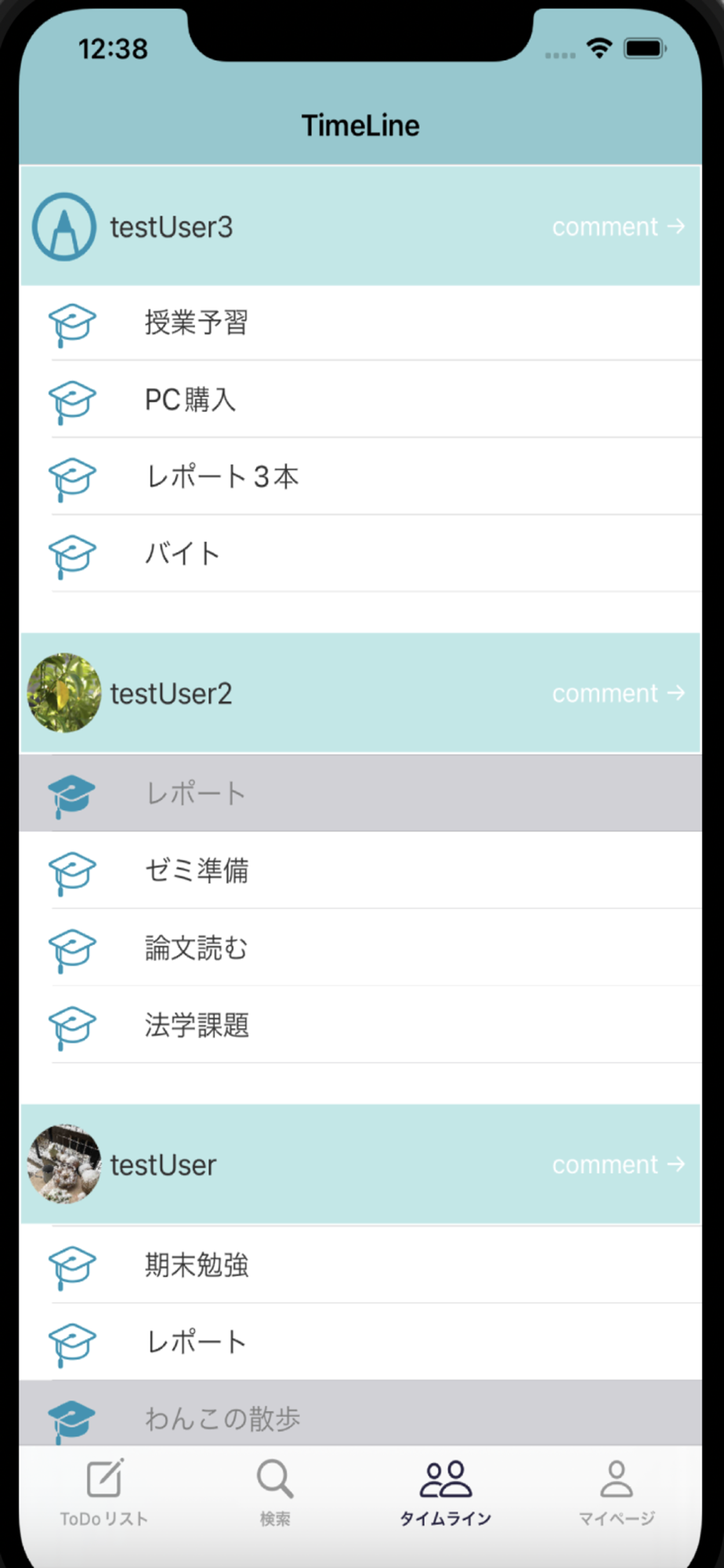 他ユーザーのアカウントを検索しフォローすると、そのユーザーの登録しているToDoリストをタイムライン上で確認することができるようになります。